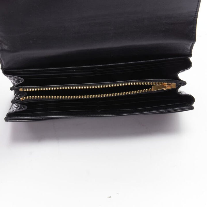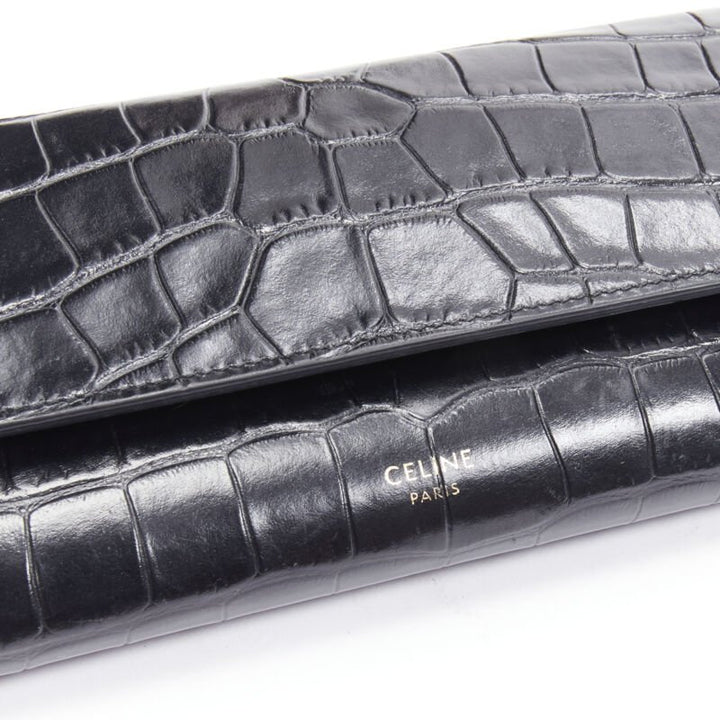 CELINE black croc embossed calfskin flap front long wallet