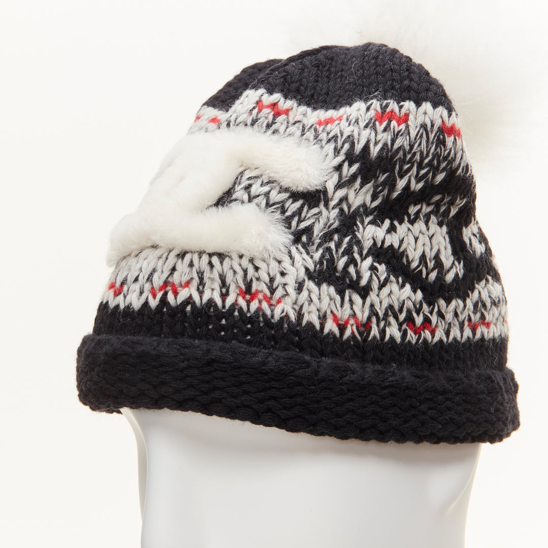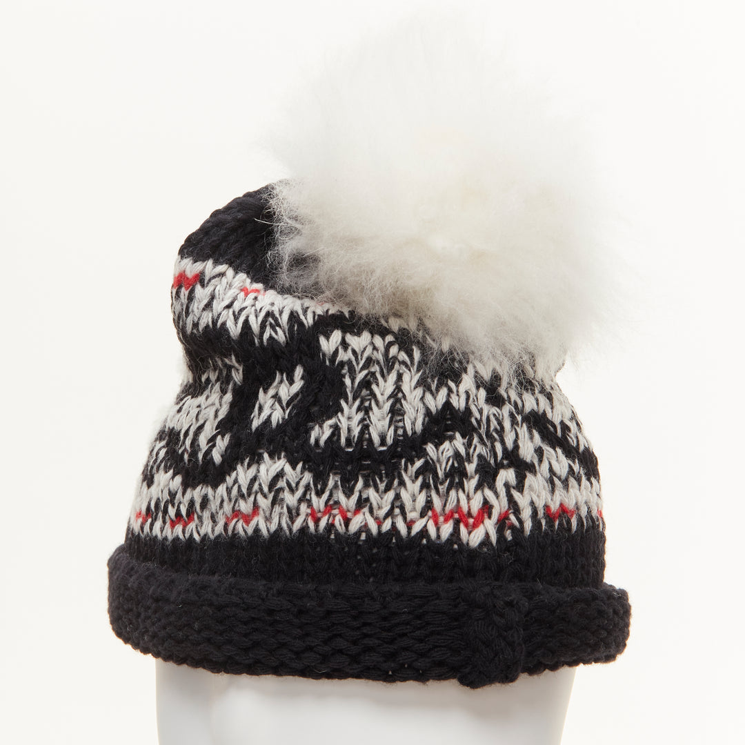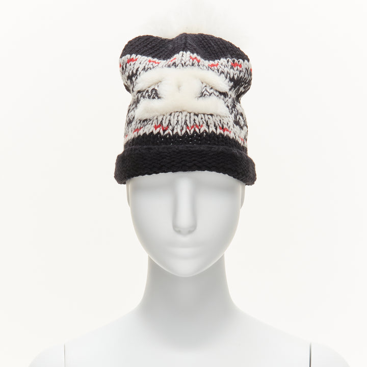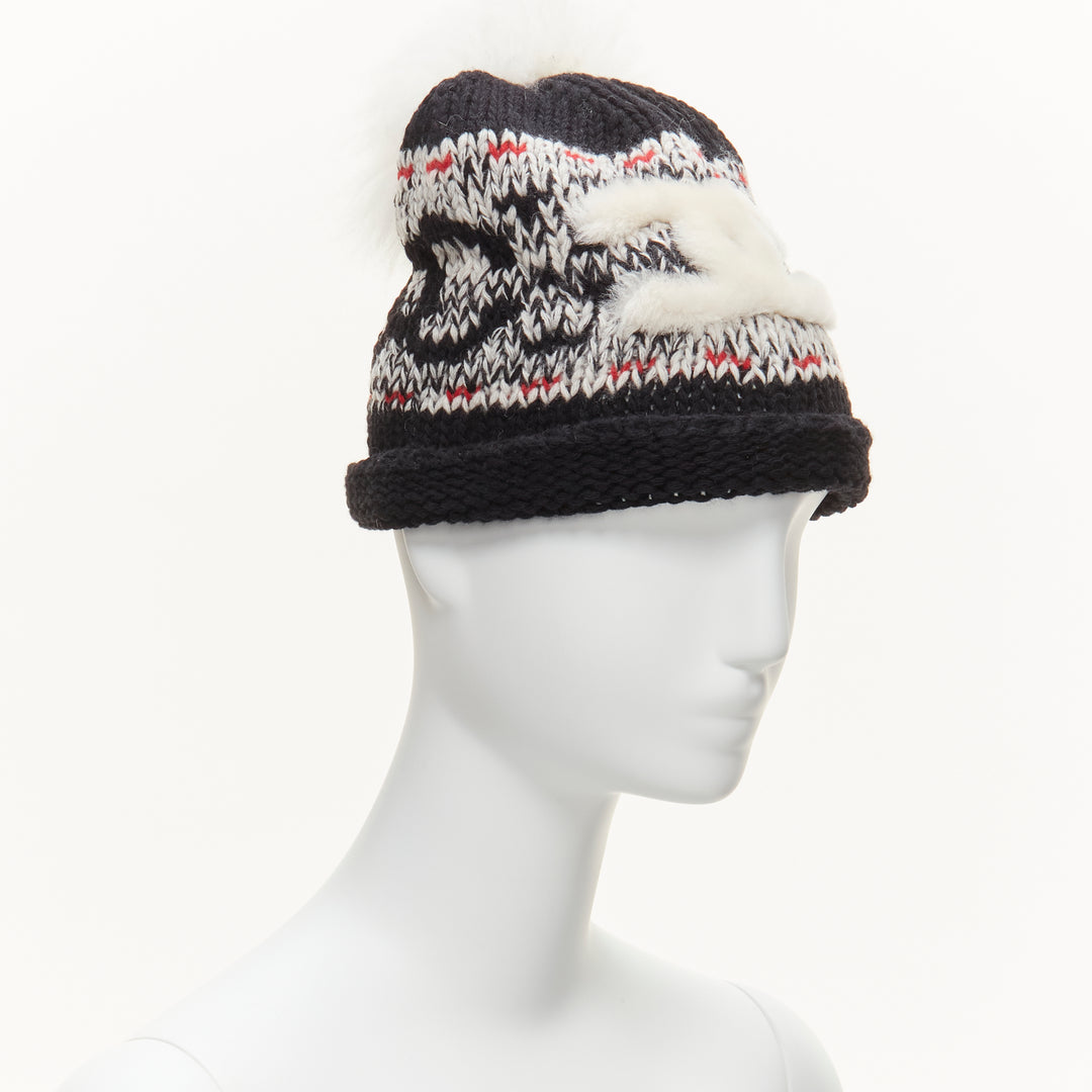 CHANEL 100% wool white CC logo pom pom black red intarsia beanie hat