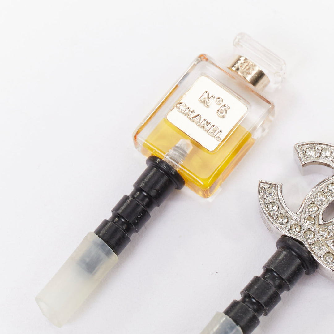 Extra Details: Crystal pave CC logo, No.5 perfume bottle and Babushka doll icons. Phone headphone jack plug charm.