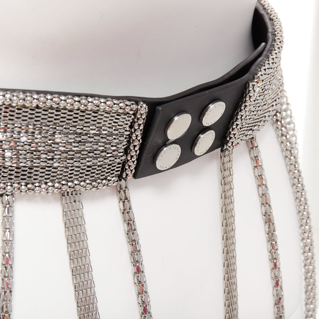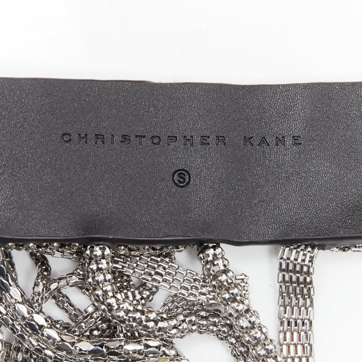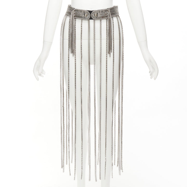 CHRISTOPHER KANE silver multi chain stud front black leather fringe belt S