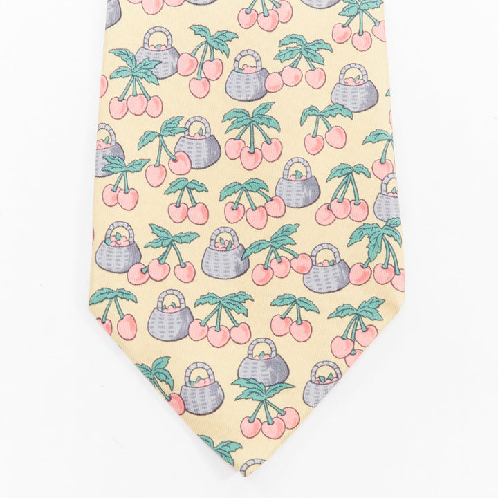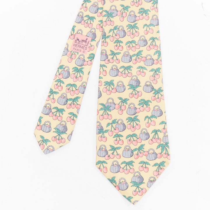 HERMES 7430 HA yellow red blue cherry basket print silk tie