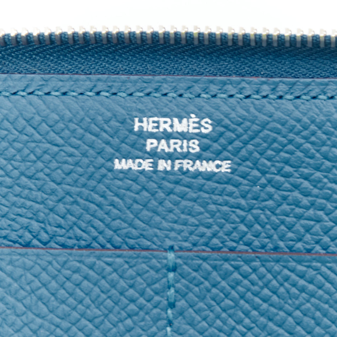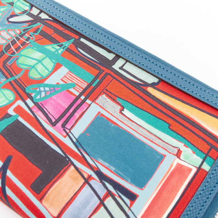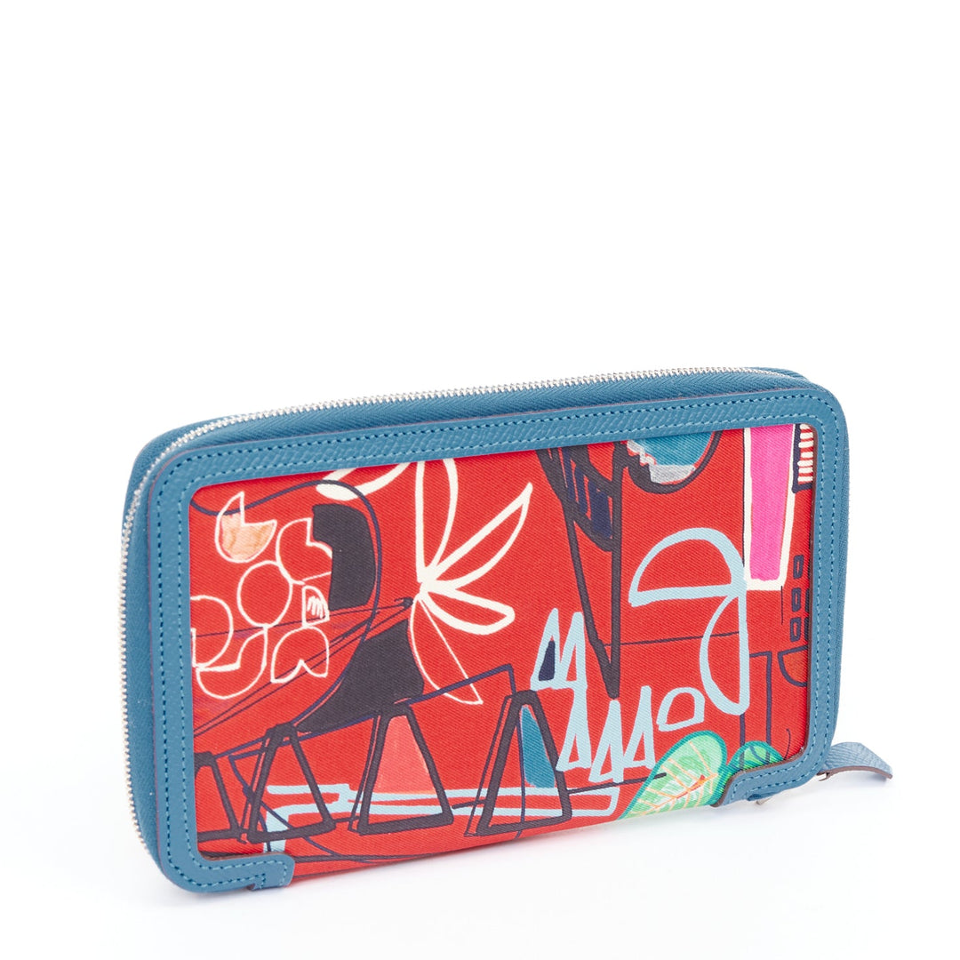 HERMES Soie Cool Azap red geometric print silk blue leather zip around wallet