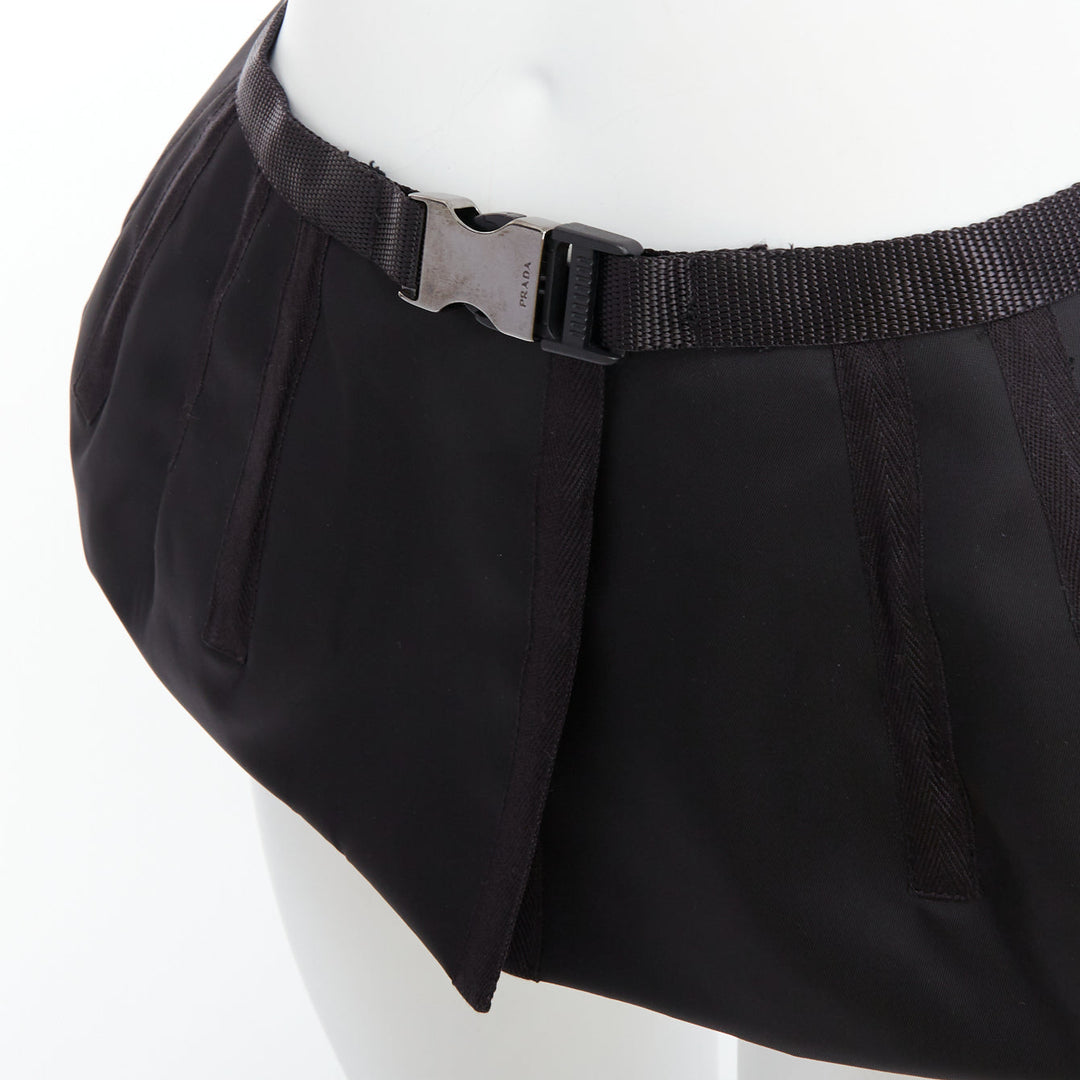 Extra Details: Black nylon Prada flared waist-cinching yoke/belt with grosgrain accents, concealed press stud front closure and gunmetal-tone side-release buckle front closure.