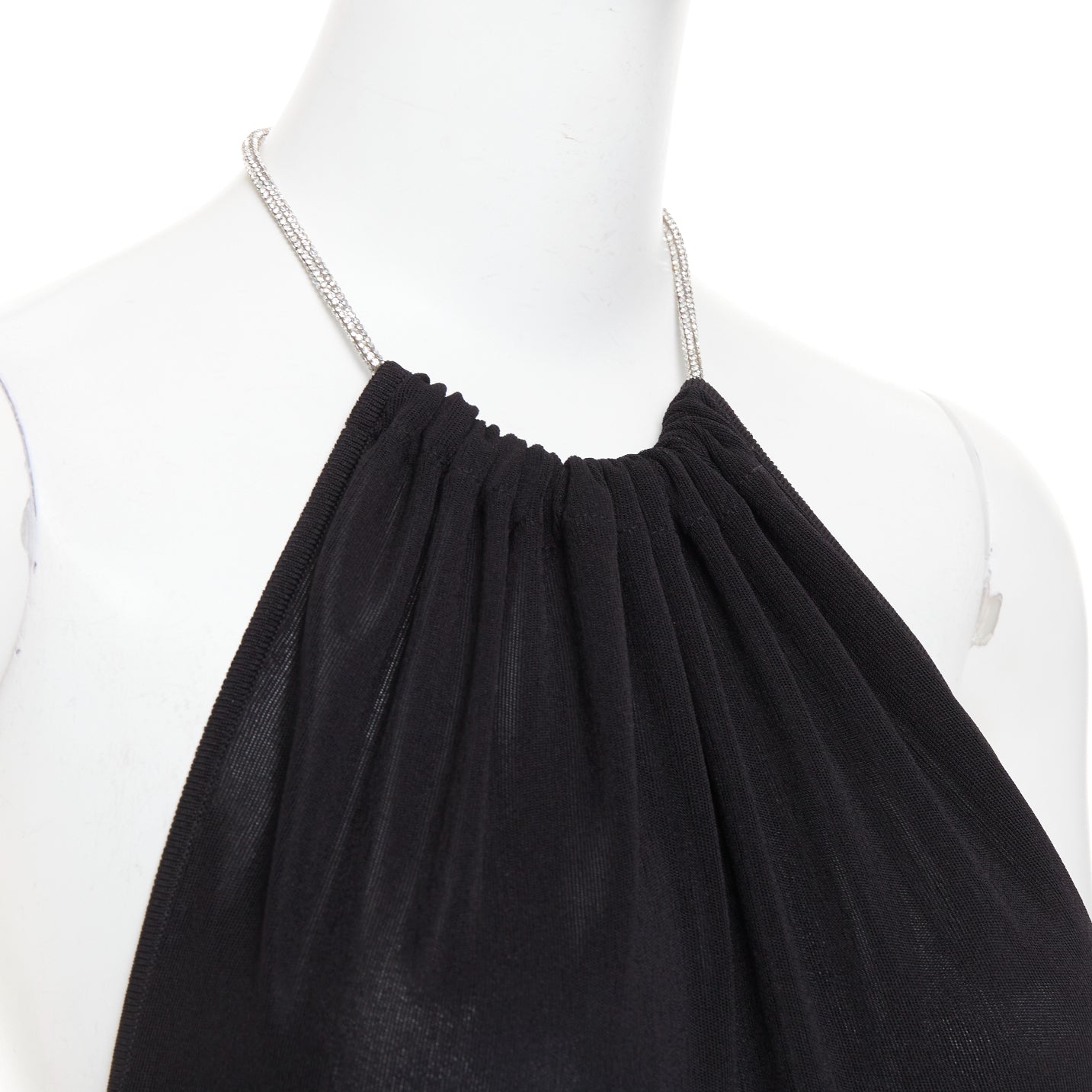 Extra Details: Crystal encrusted rope tie neckline. Open back. Fine knit-semi sheer.