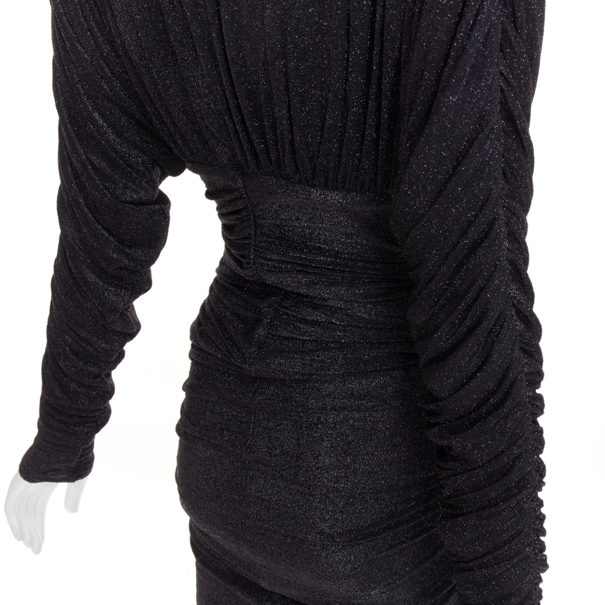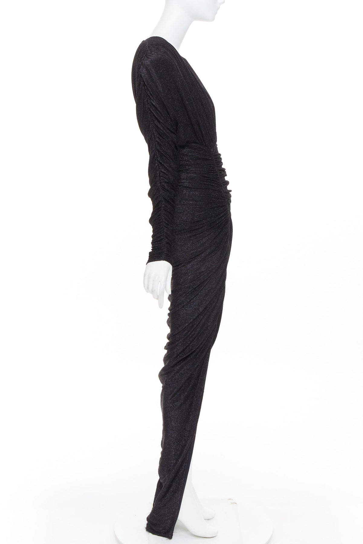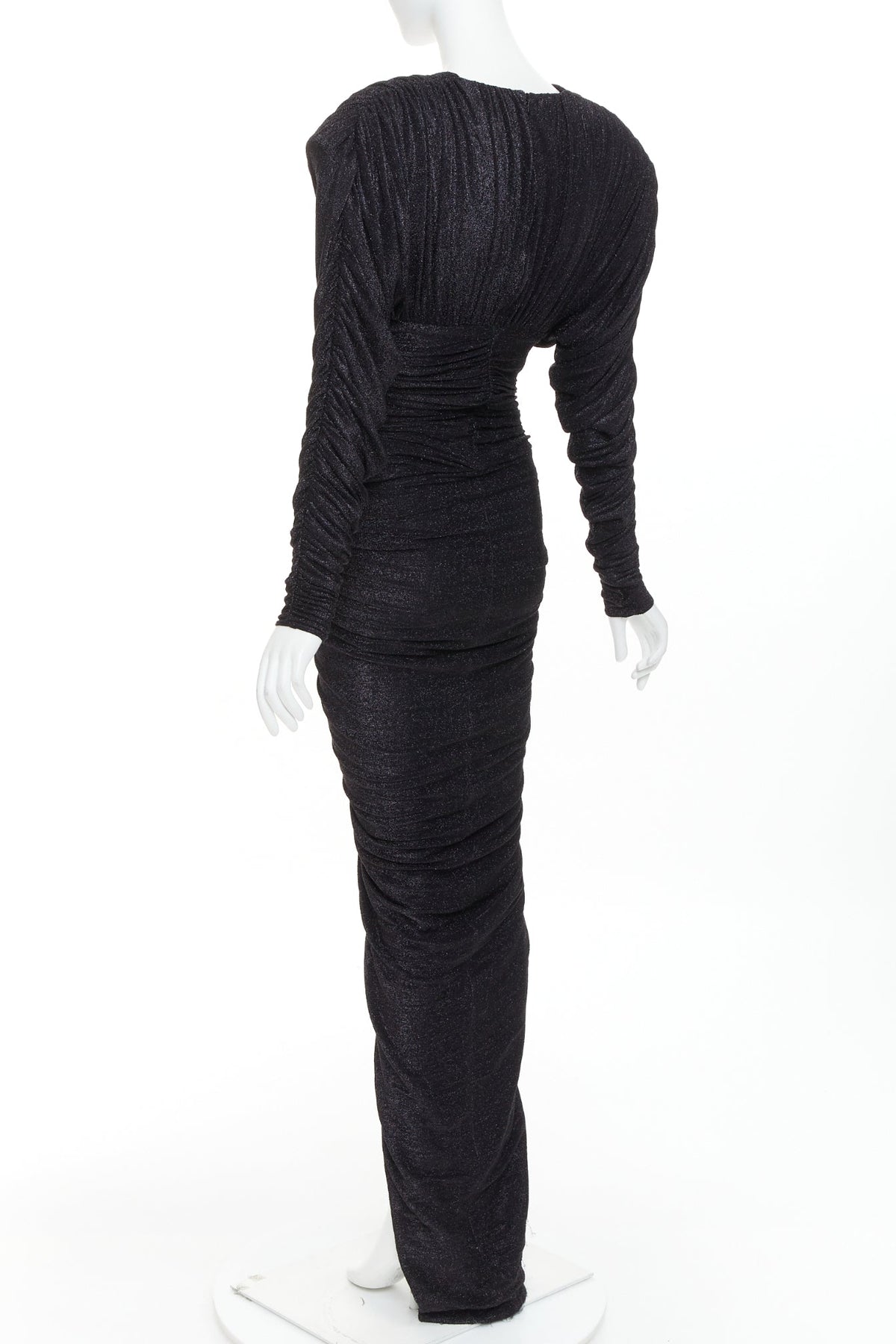 Extra Details: Black metallic silver lurex fine knit. Alexandre Vauthier long-sleeved fine knit gown. It is designed with a deep V-neck, structured Power shoulders with pads, ruched detailing, and a high front slit. Crafted from metallic lurex fine knit, the dress has a slim fit that accentuates the figure.