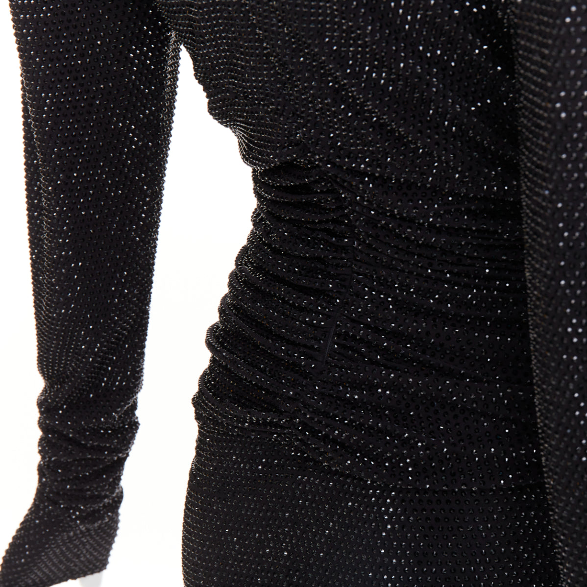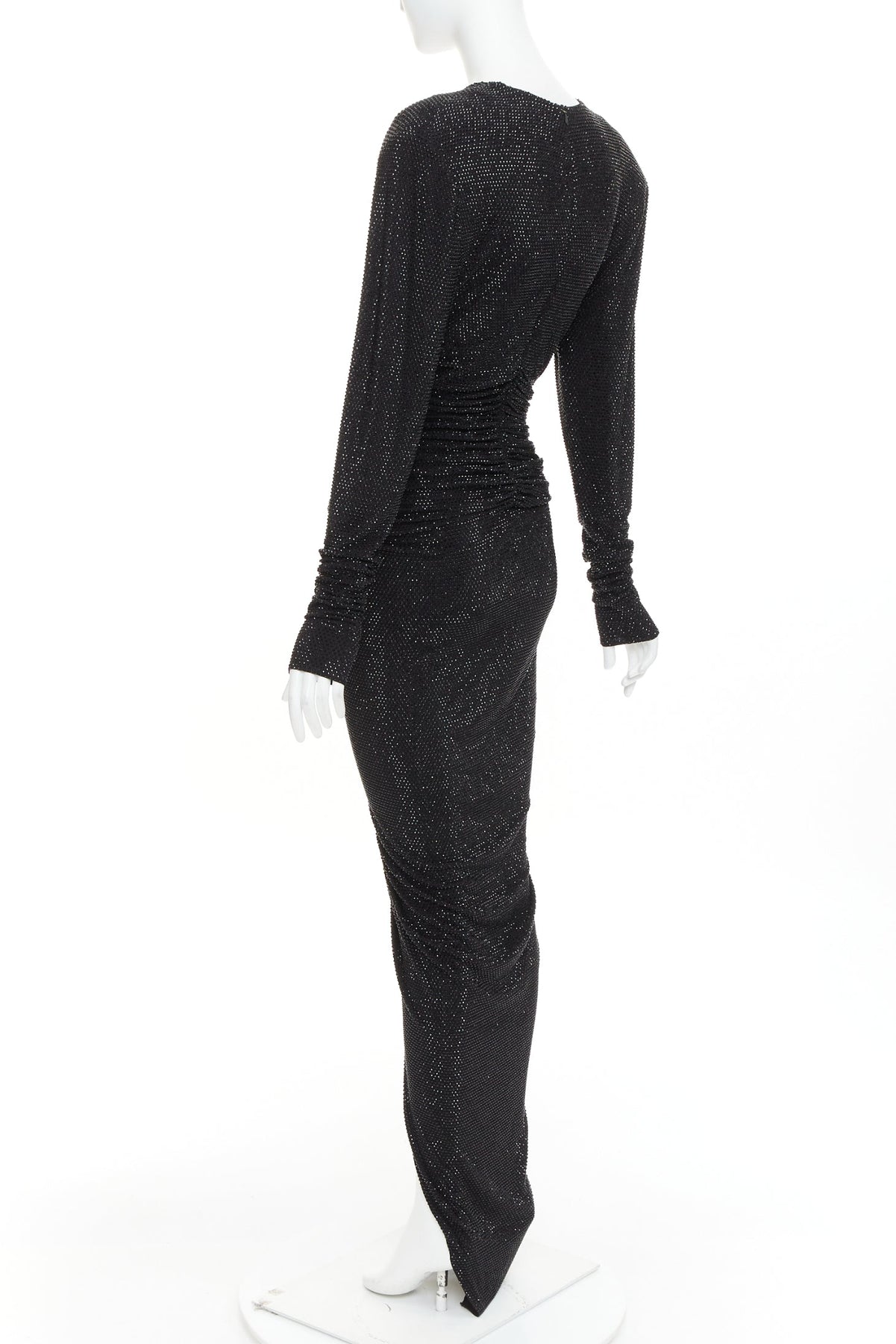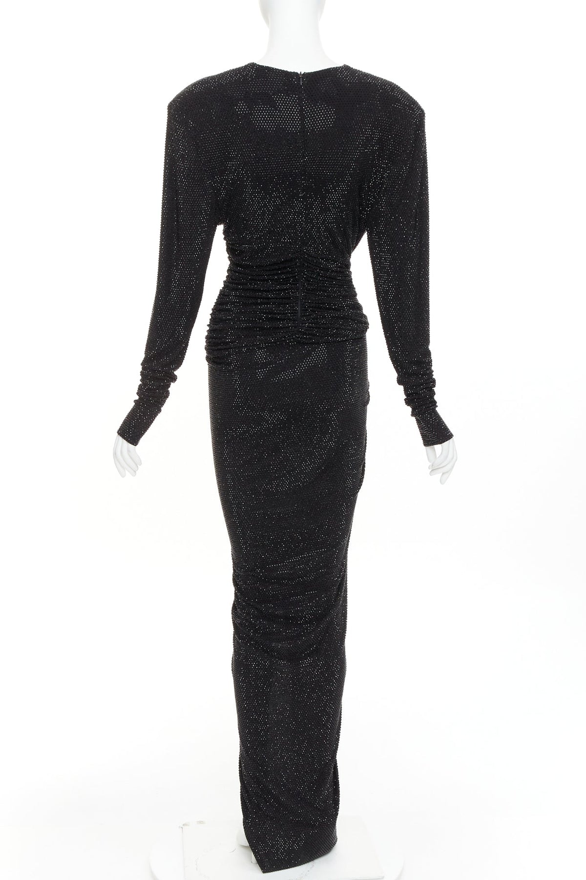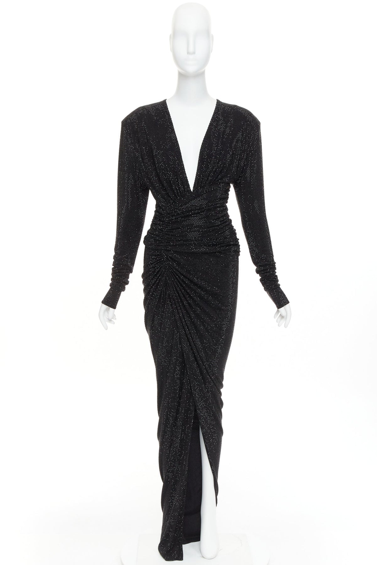 Extra Details: Alexandre Vauthier long-sleeved strass crystal encrusted gown. It is designed with a deep V-neck, structured Power shoulders with pads, ruched detailing, and a high front slit. Crafted from stretch-viscose blend, the dress has a slim fit that accentuates the figure.