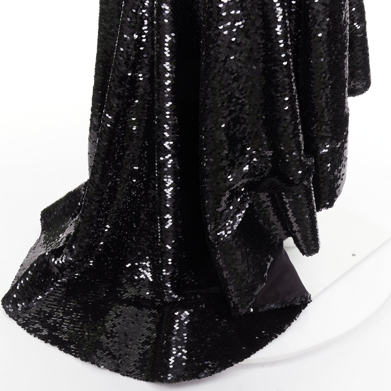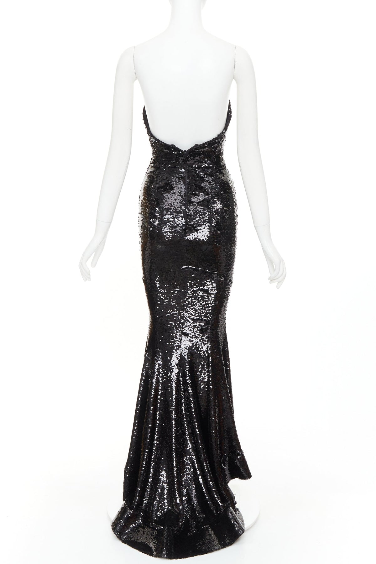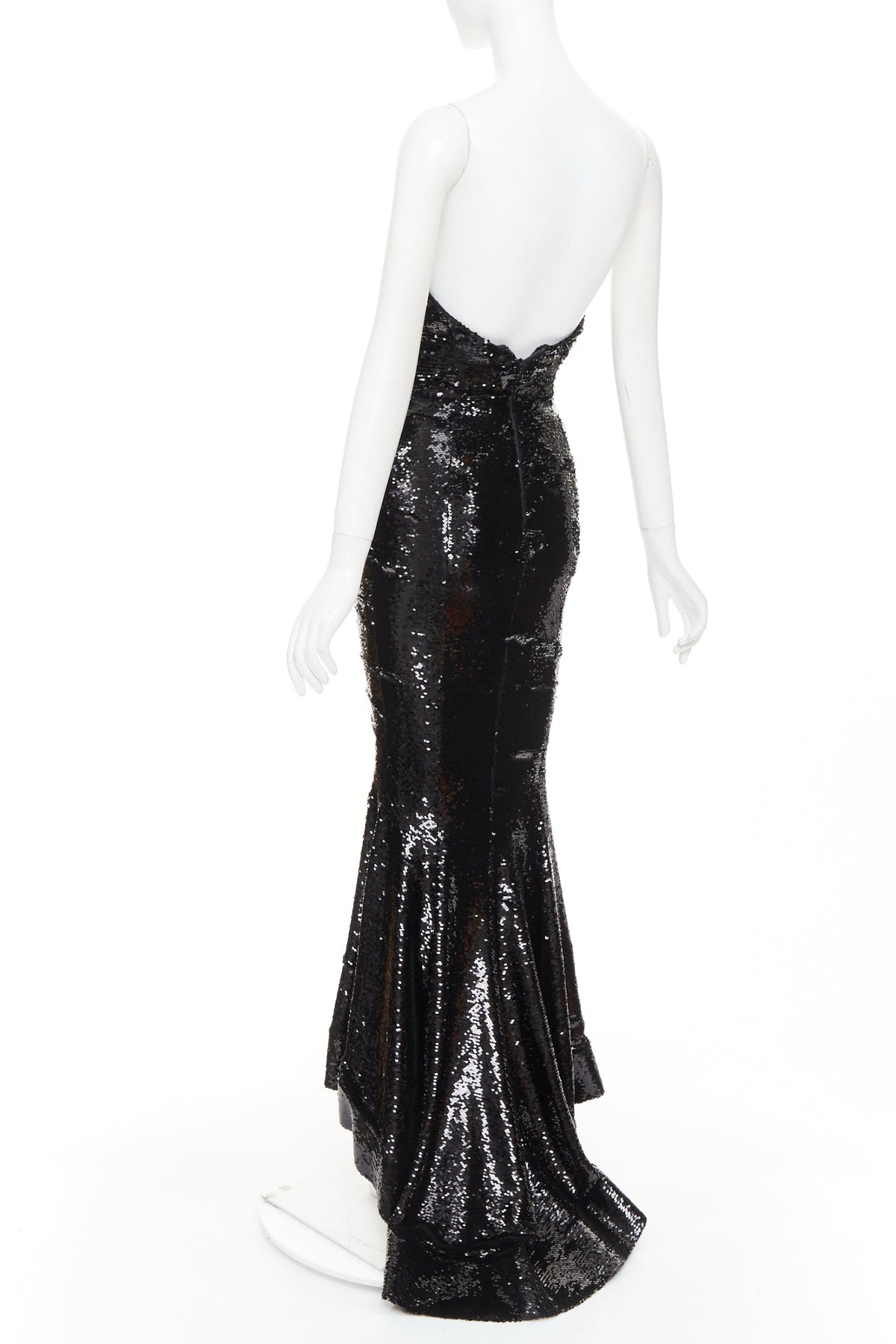 Extra Details: The gown is crafted from a stretch-jersey base that is entirely encrusted with shimmering black micro-sequins, creating a liquid-like metallic finish. It features a sophisticated strapless concave neckline that creates a sculptural, feminine frame. The design follows a form-fitting mermaid silhouette, cinching at the waist and hips to emphasize an hourglass shape. It is defined by a dramatic asymmetrical high-low hemline, which is shorter in the front and cascades into a floor-length fishtail train at the back. Includes internal boning for structure and a concealed rear zip for a seamless fit.