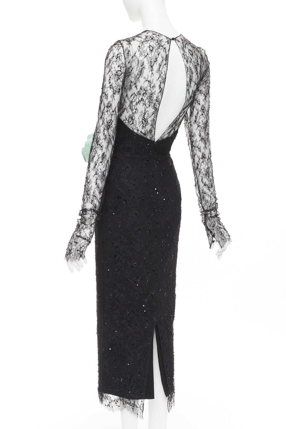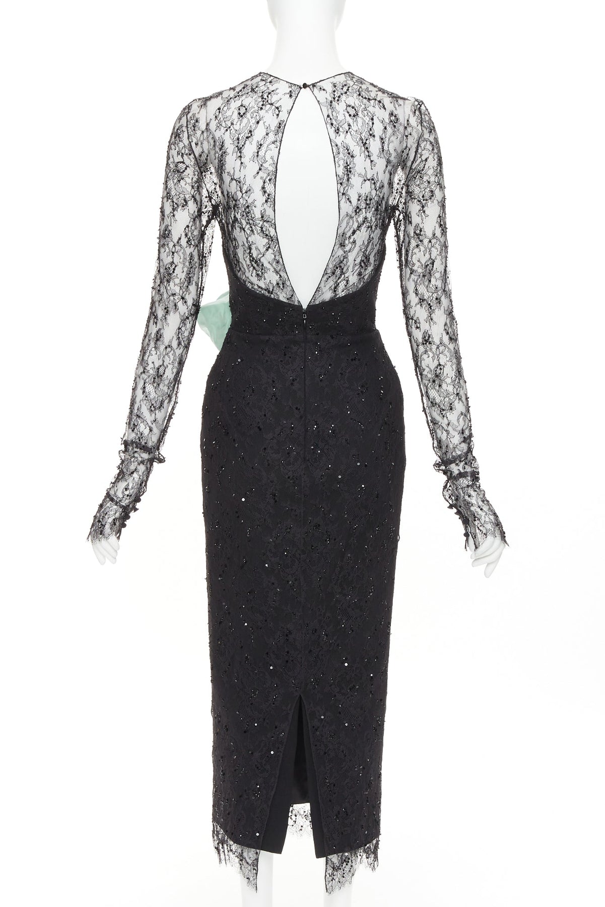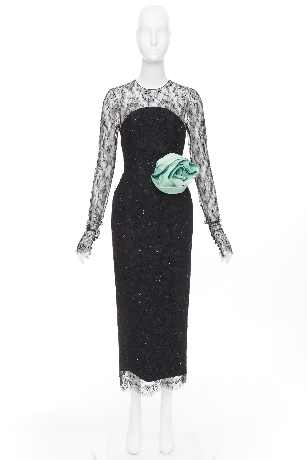 Extra Details: The black lace and sequin midi dress with the mint green rose is a vintage Alexandre Vauthier creation. A striking rosette detail on waist and crystallised lace.
