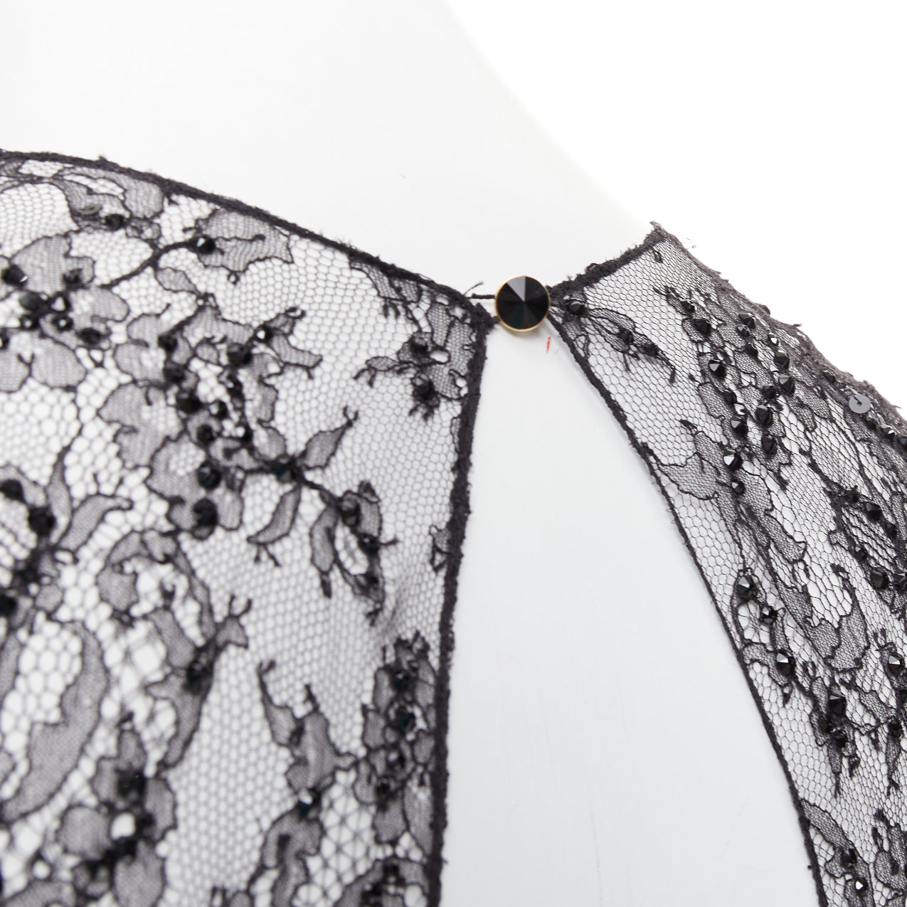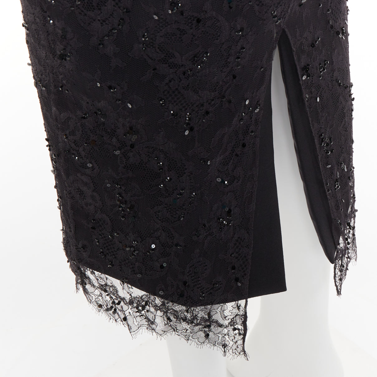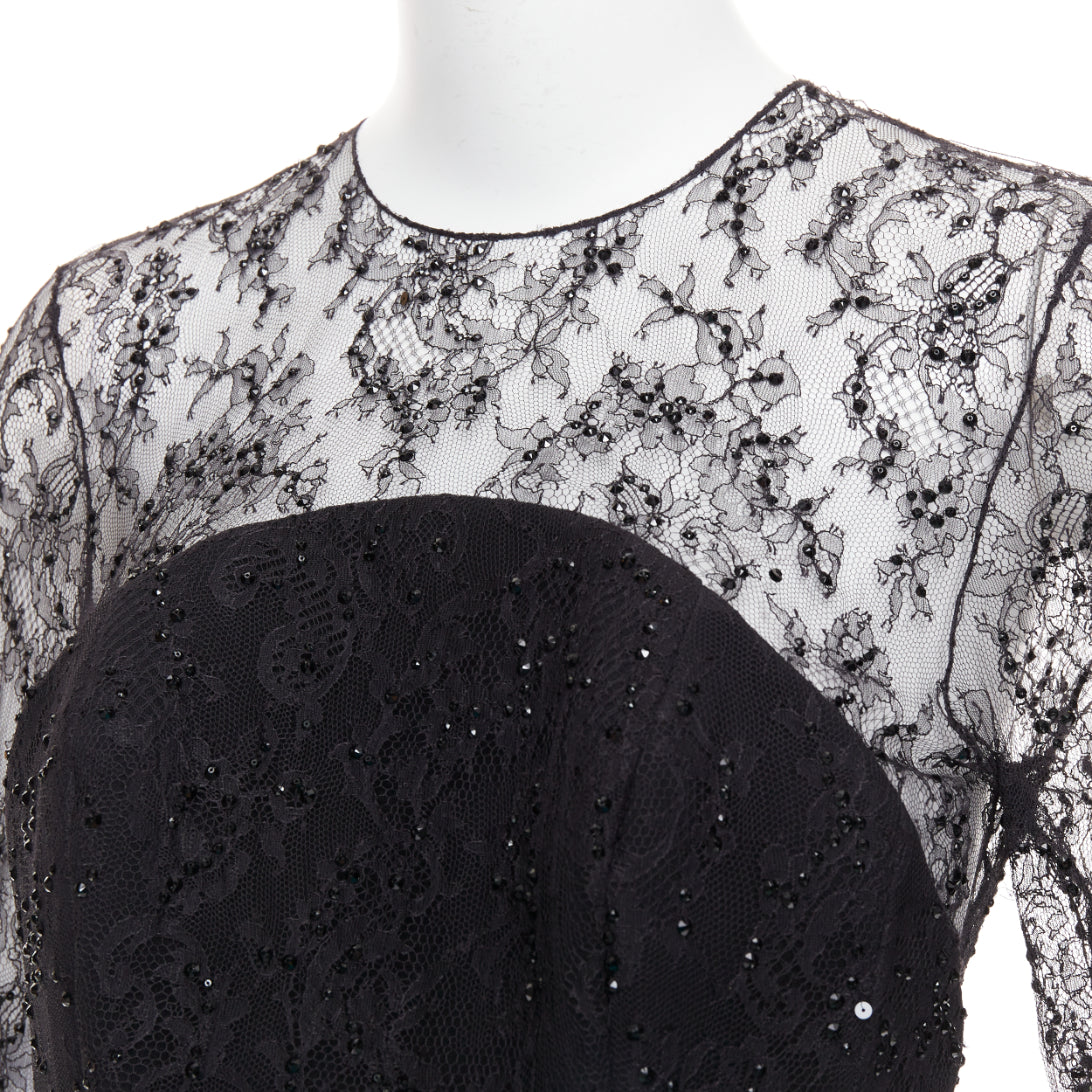 Extra Details: The black lace and sequin midi dress with the mint green rose is a vintage Alexandre Vauthier creation. A striking rosette detail on waist and crystallised lace.