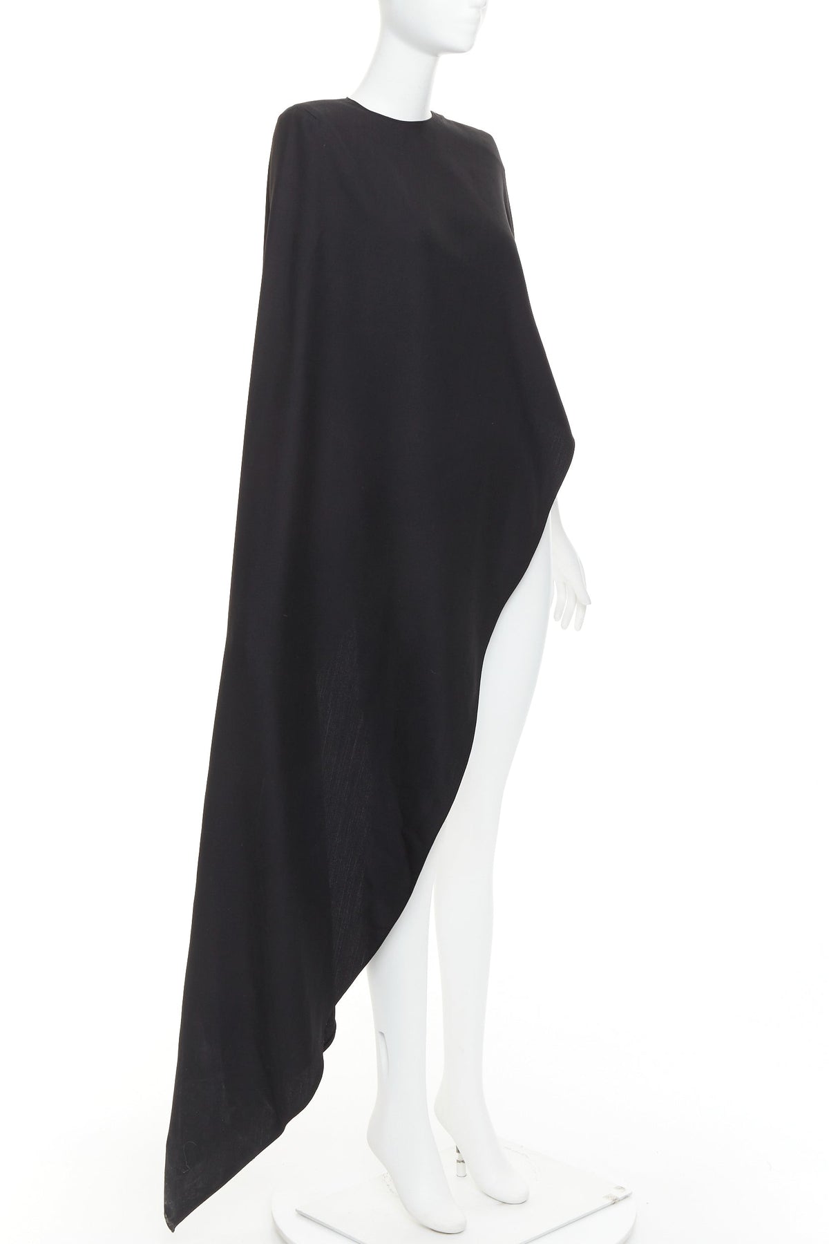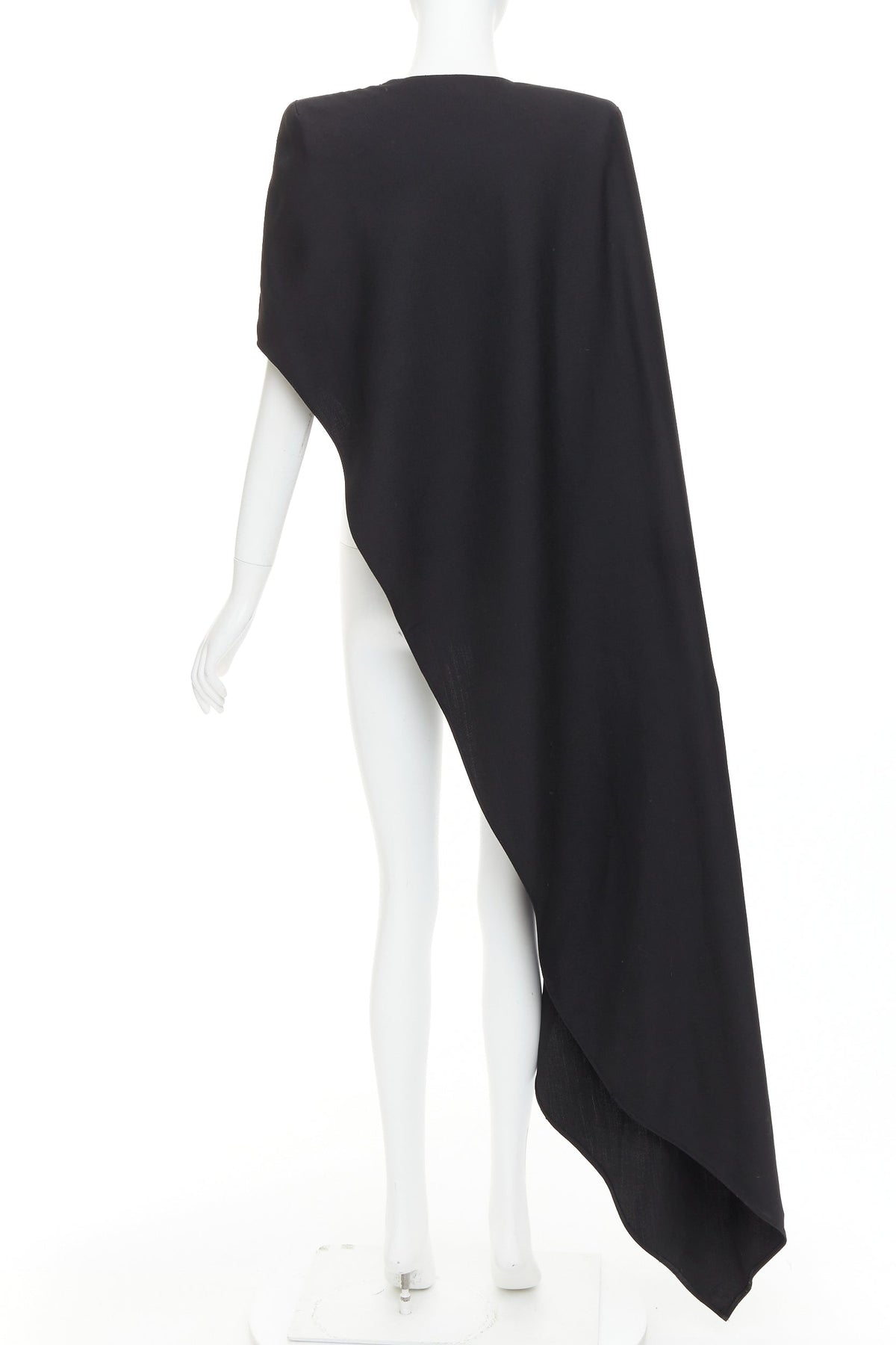 Extra Details: It features a striking one-shoulder design with a single shoulder pad and an dramatically asymmetrical, cascading maxi hemline.