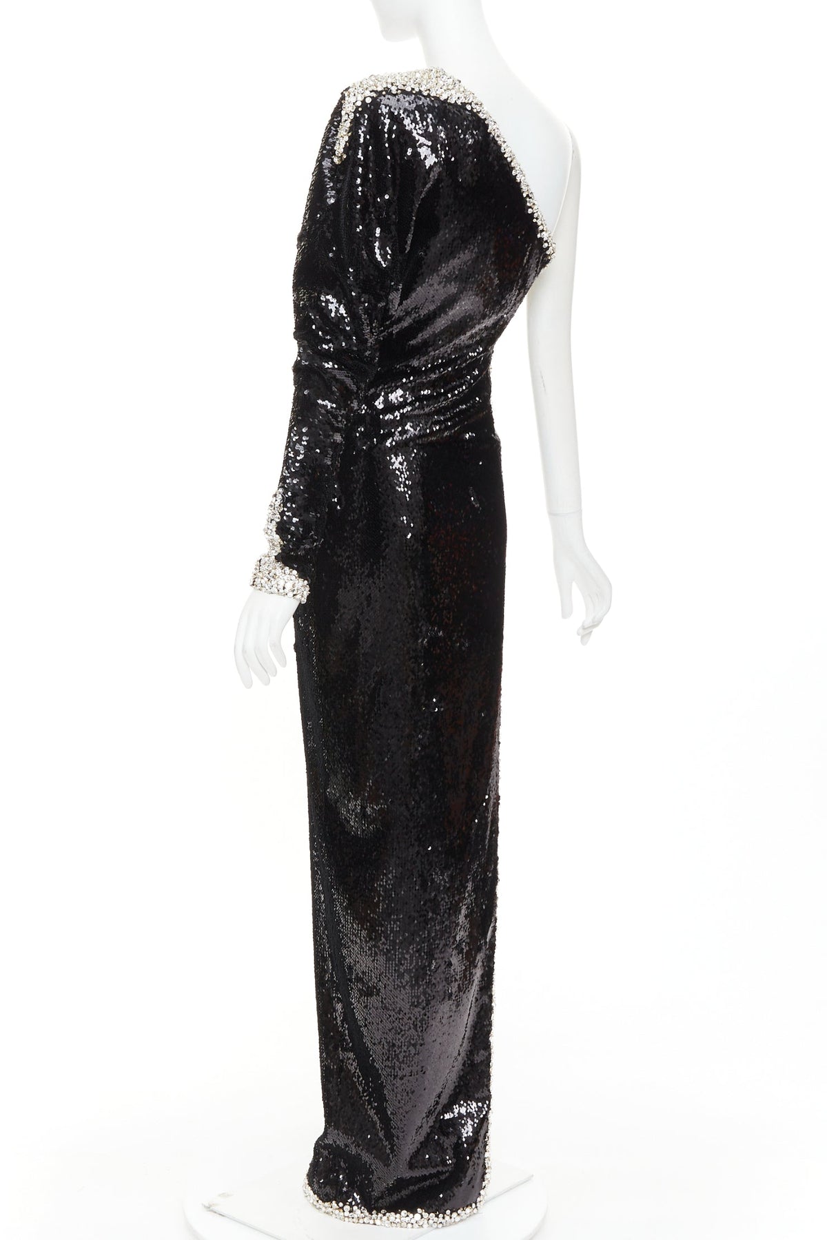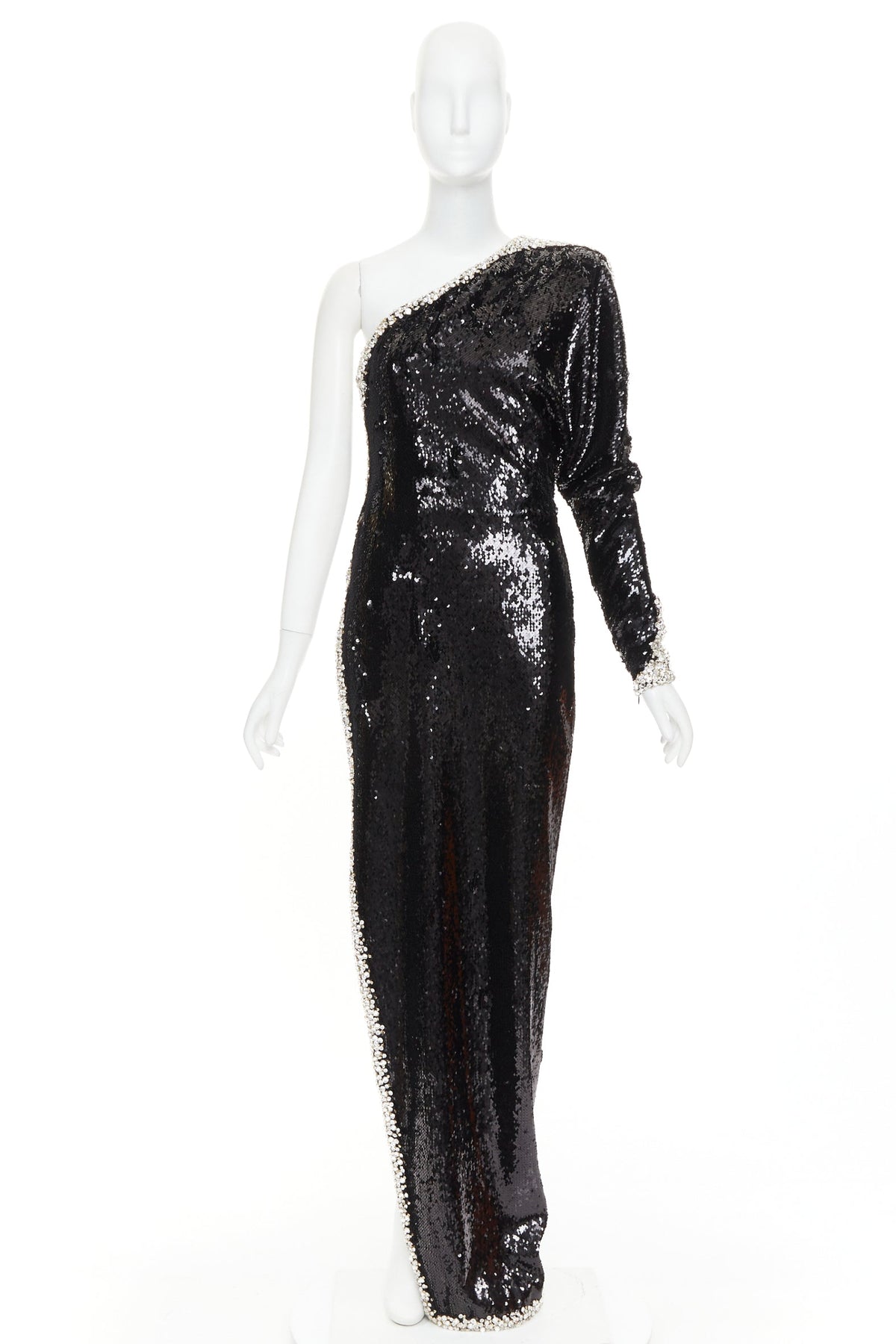 Extra Details: The gown is crafted from a fluid stretch-jersey base that is entirely encrusted with shimmering black micro-sequins. It features a sophisticated one-shoulder neckline and a single long sleeve with structured shoulder padding. A defining feature is the silver glass crystal rhinestone glass that runs along the edge of the asymmetrical neckline and continues down a dramatic, thigh-high side slit and at sleeve cuff. The dress is designed with a form-fitting, body-conscious cut that cinches at the waist to create a sculptural silhouette.