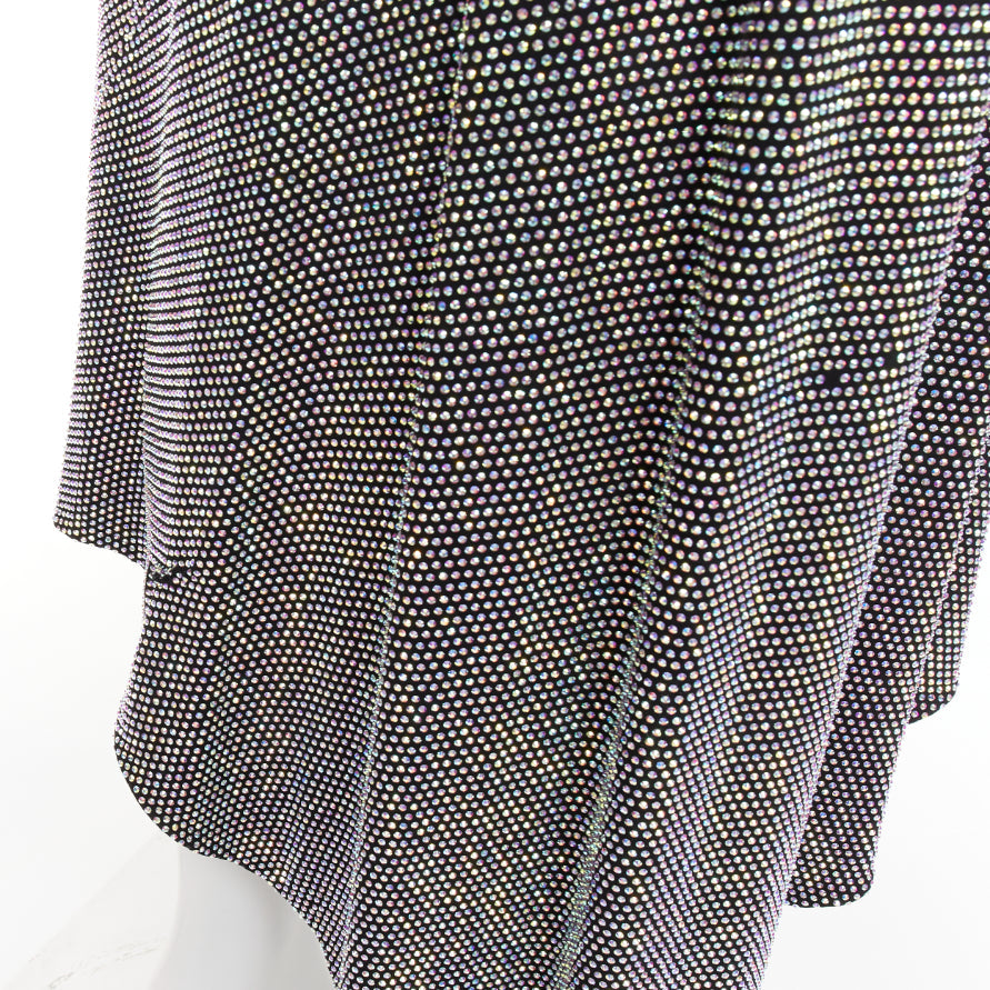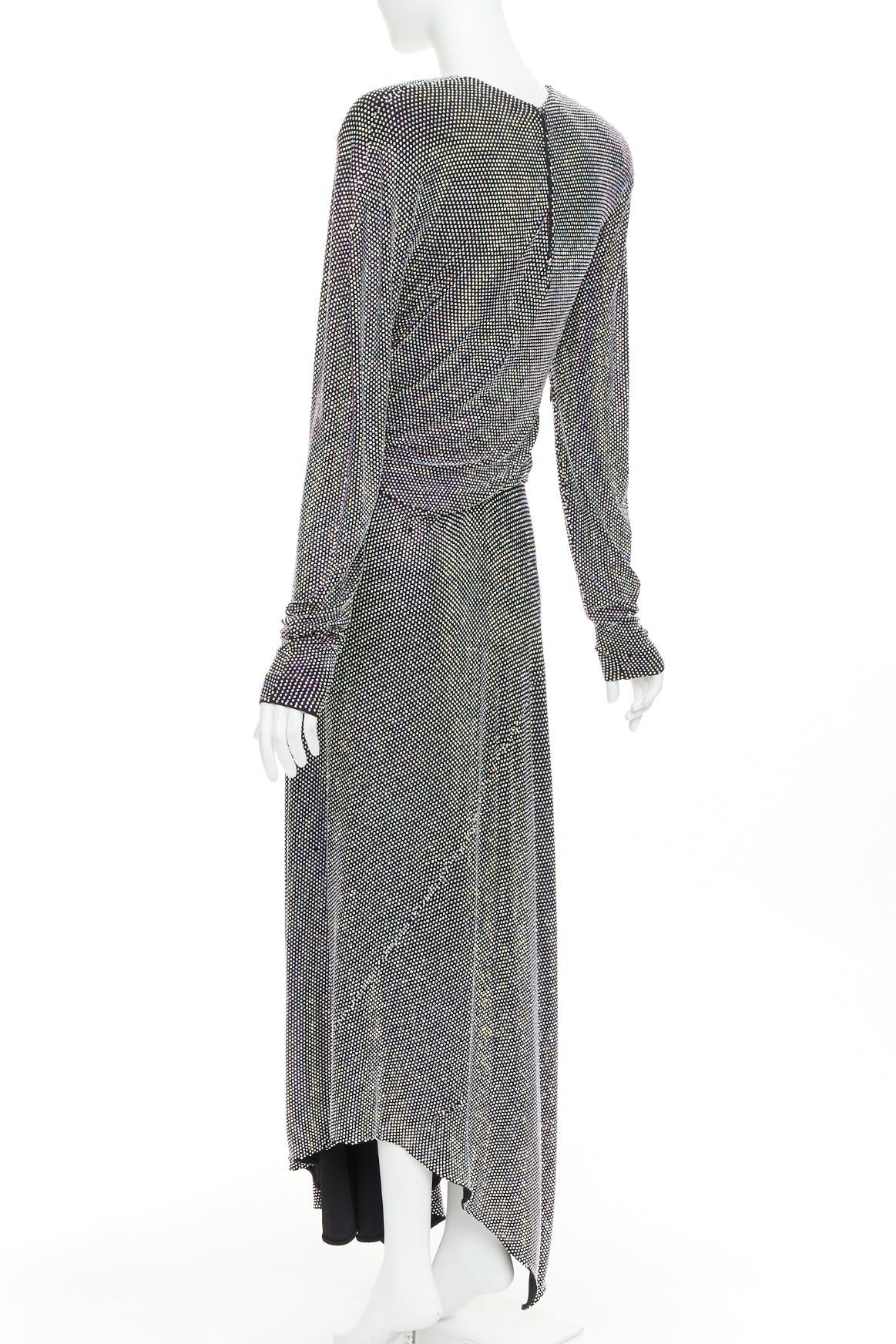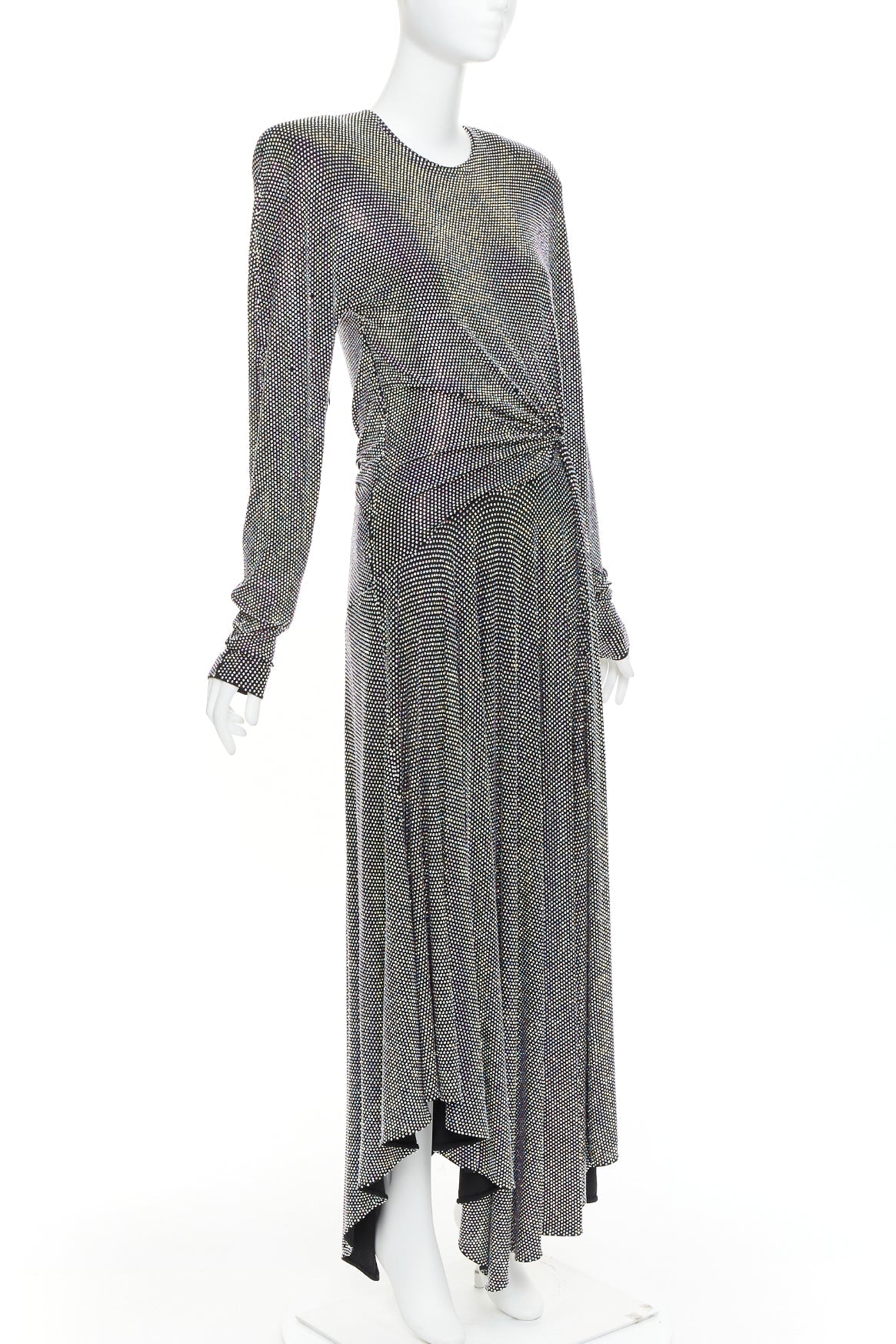 Extra Details: The specific style features a crew neck, structured shoulders, a ruched waist, and an asymmetrical midi hem. Iridescent crystal encrusted, silver or purple metallic, which catches the light.