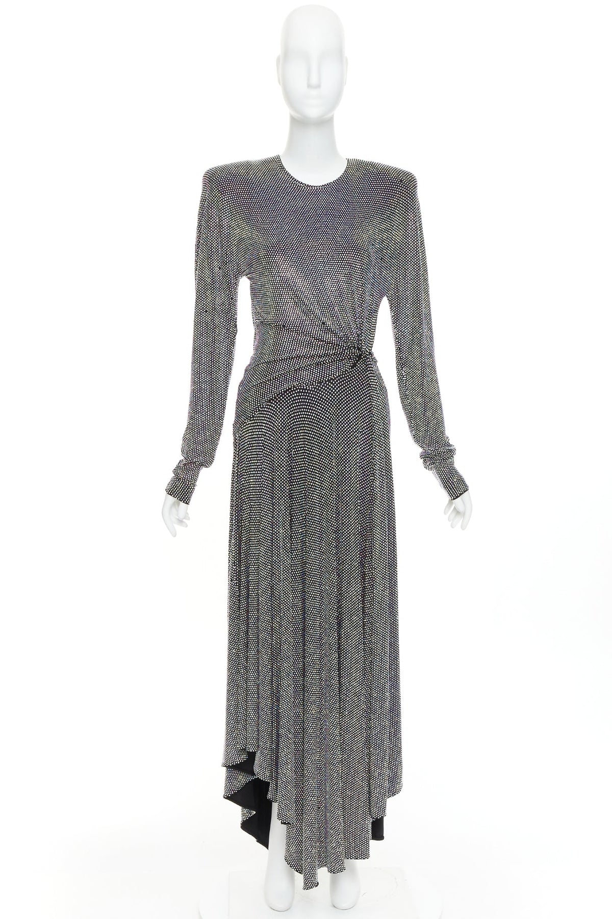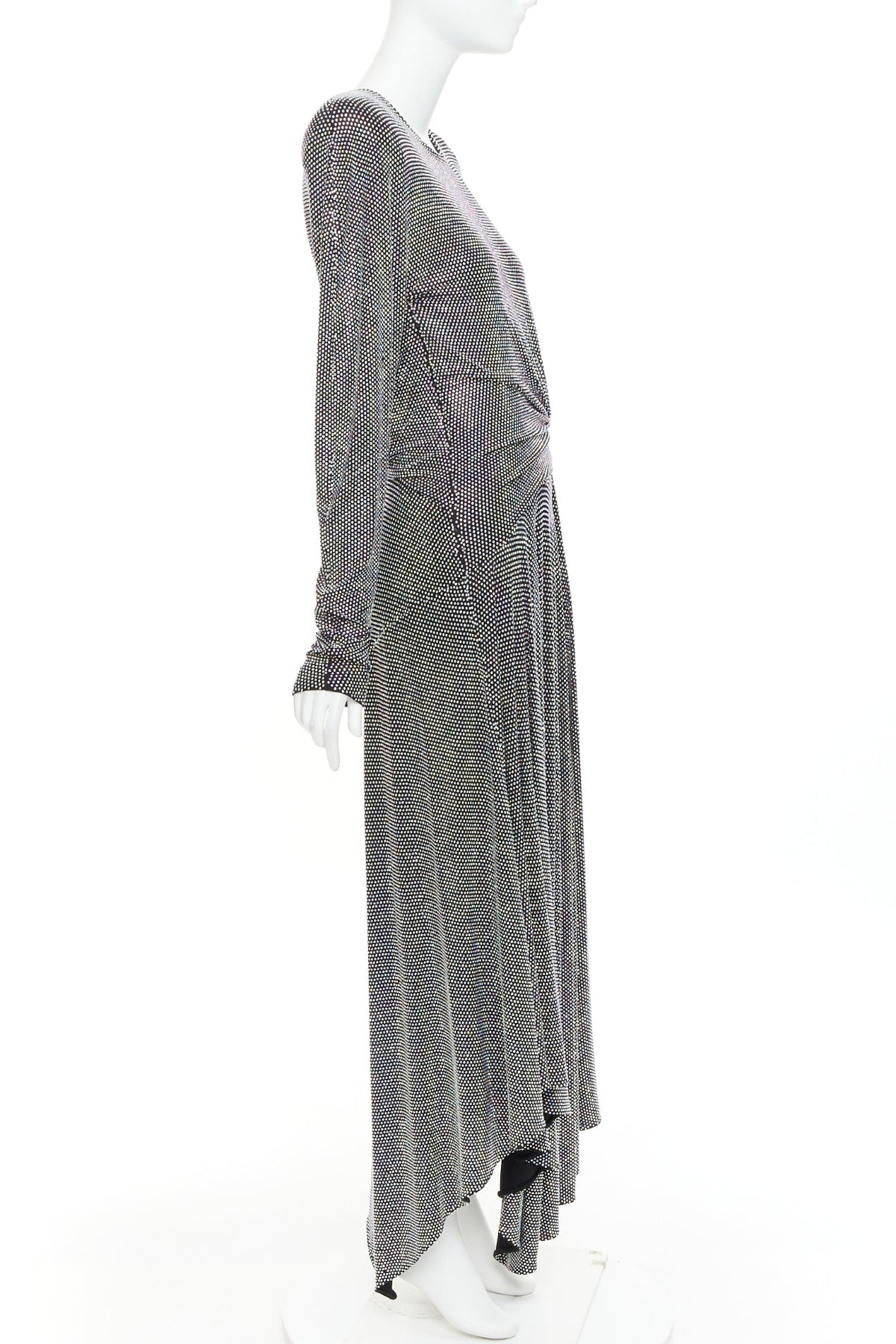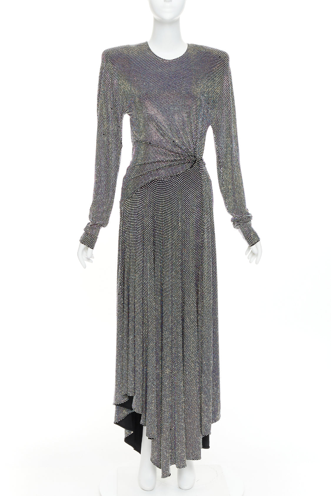 Extra Details: The specific style features a crew neck, structured shoulders, a ruched waist, and an asymmetrical midi hem. Iridescent crystal encrusted, silver or purple metallic, which catches the light.