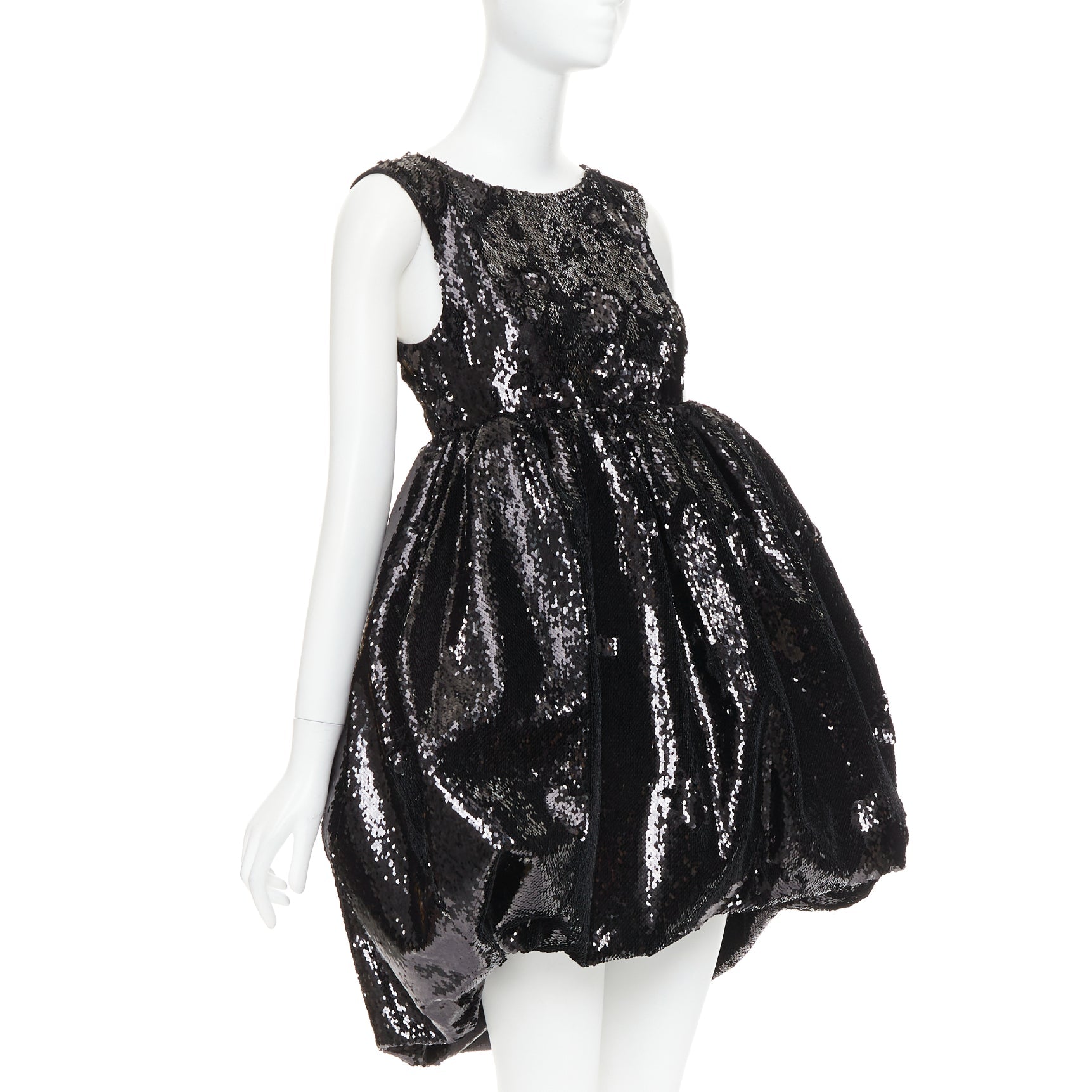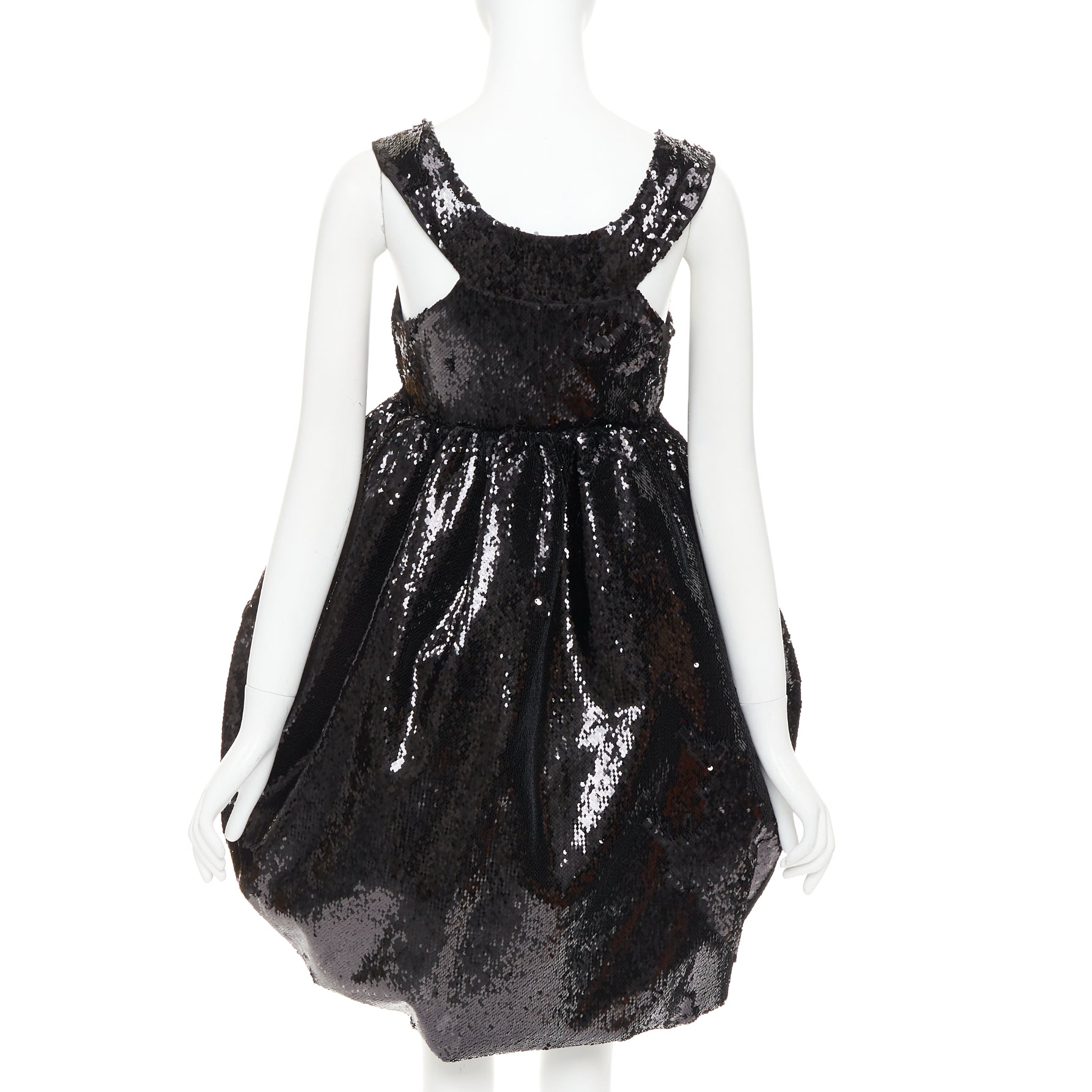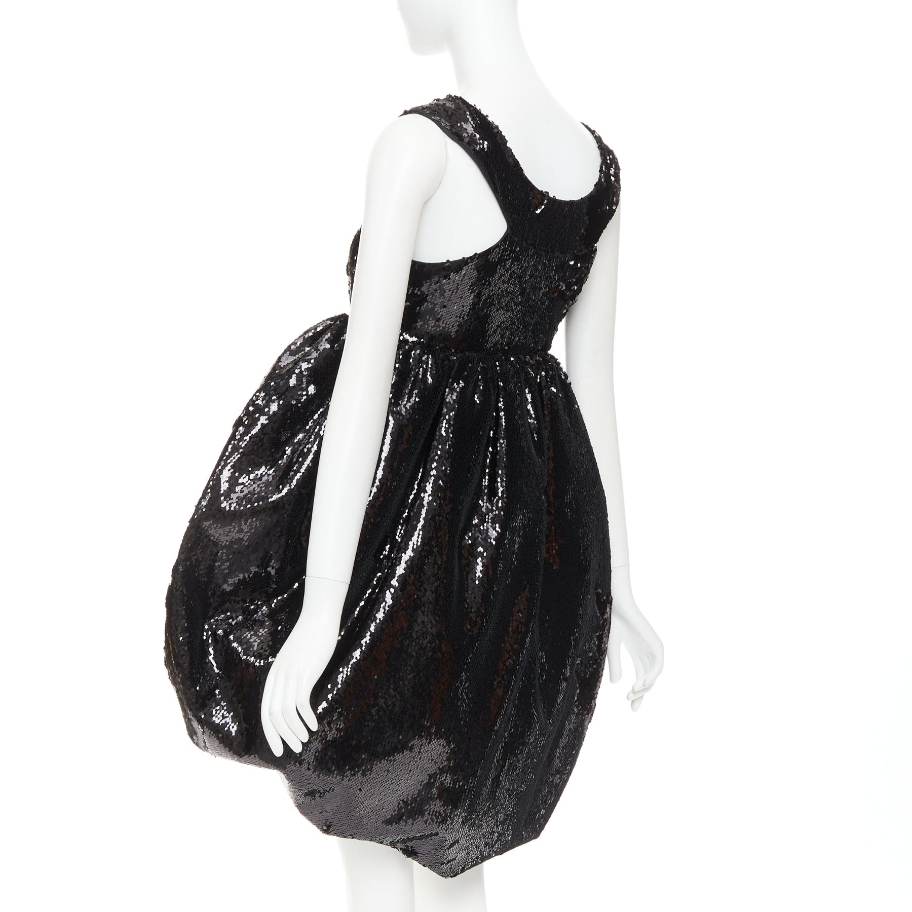 Extra Details: Black sequin embellishment. Wide neckline. Racer back neckline. Hook eye side zip closure. Dual side seam pockets. Concealed structured stuff tulle lining to hold structured silhouette. Dramatic pouf balloon silhouette. Fully lined in silk for comfort.