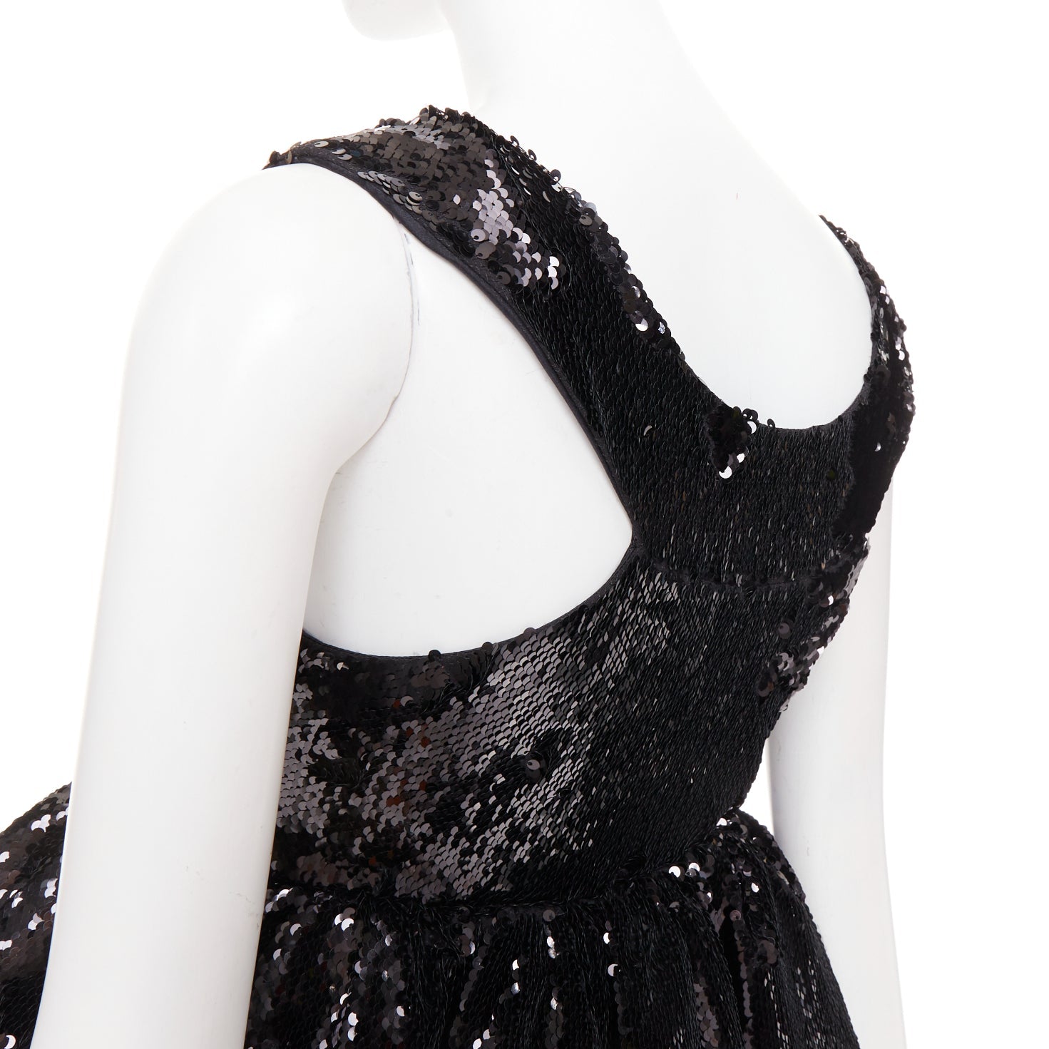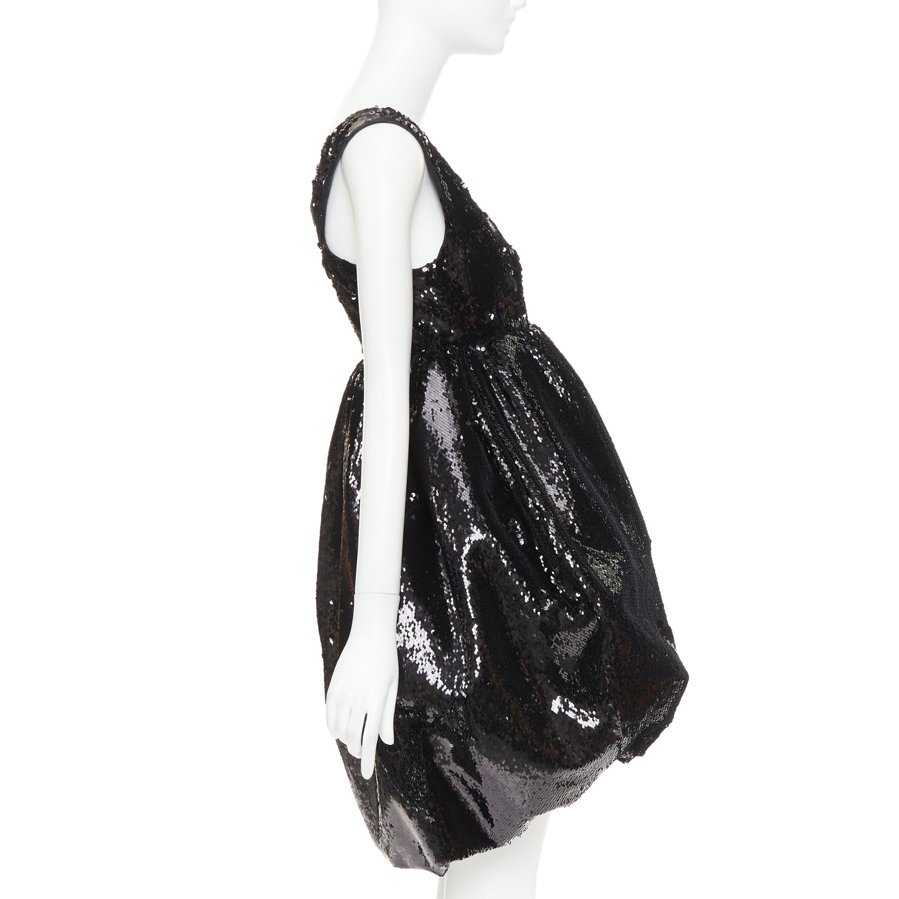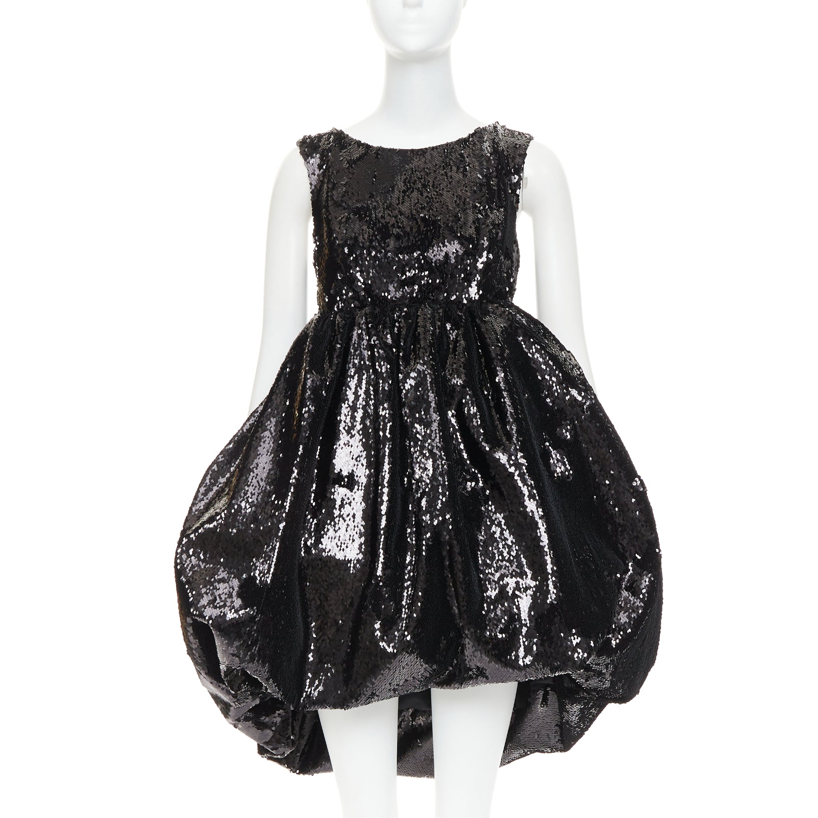 Extra Details: Black sequin embellishment. Wide neckline. Racer back neckline. Hook eye side zip closure. Dual side seam pockets. Concealed structured stuff tulle lining to hold structured silhouette. Dramatic pouf balloon silhouette. Fully lined in silk for comfort.