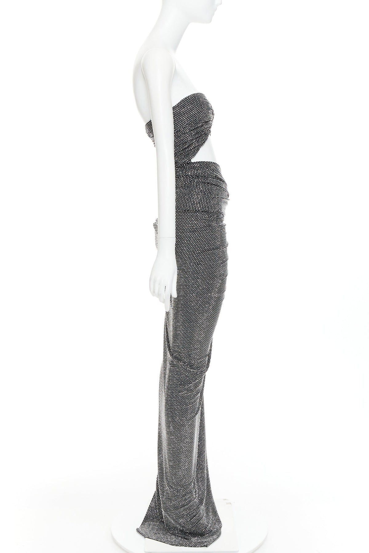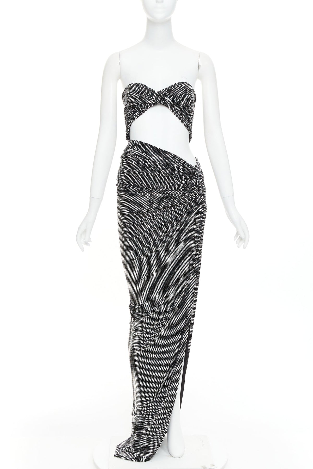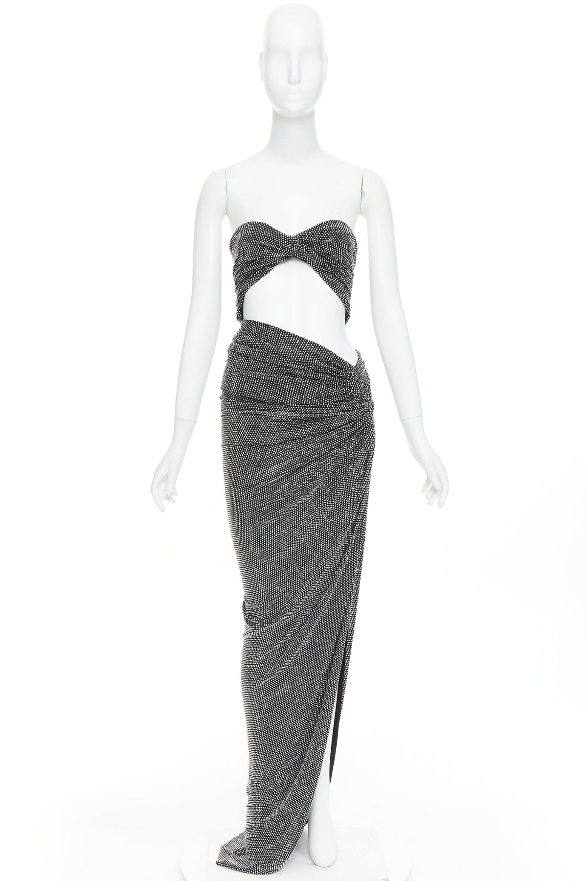 Extra Details: Twisted bandeau bodice. Cut out at waist. Side draped slit. Zip closure. Fully enbellished in silver strass crystals.