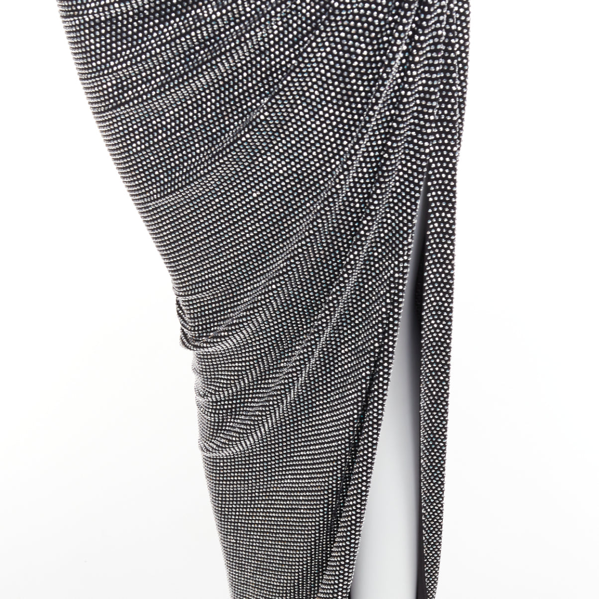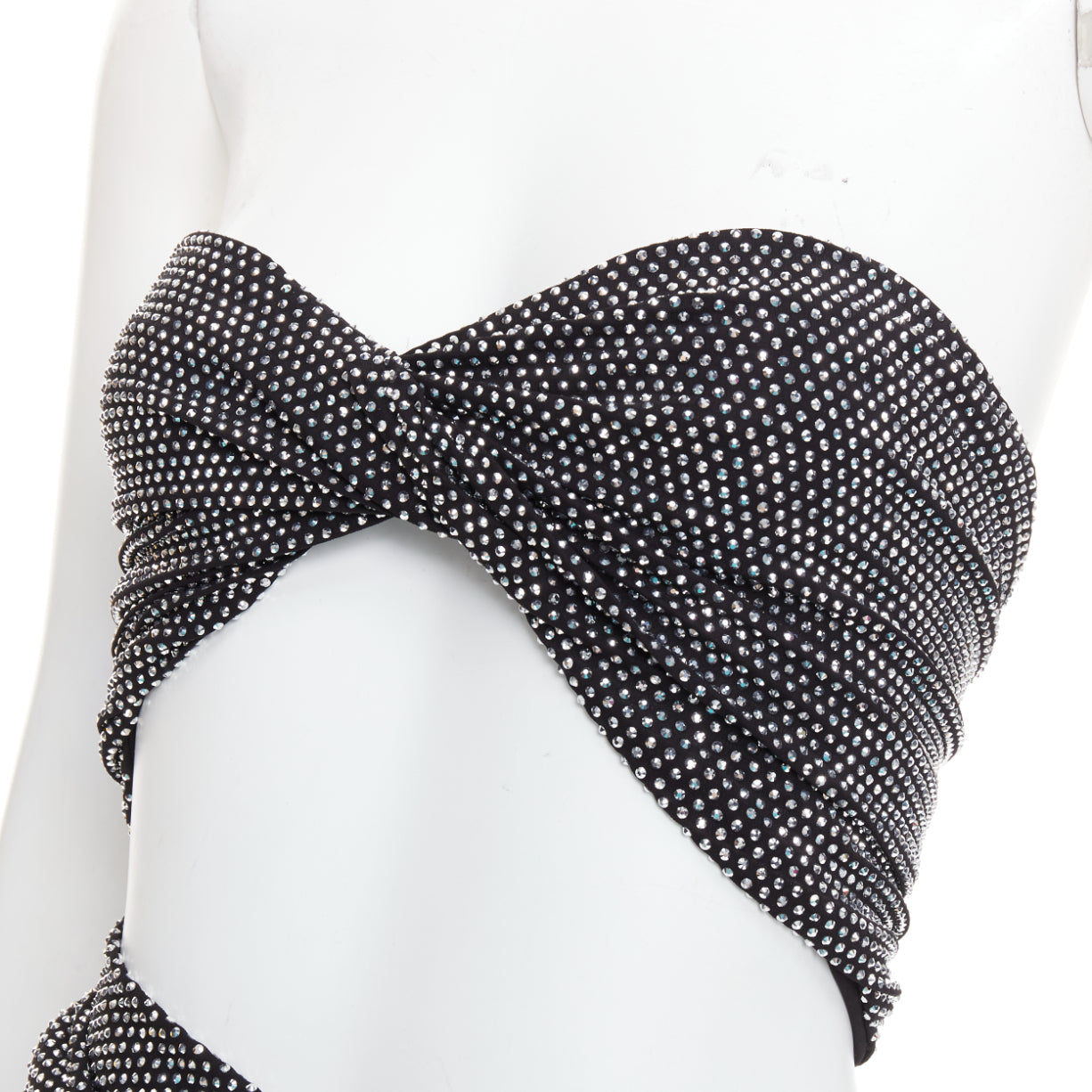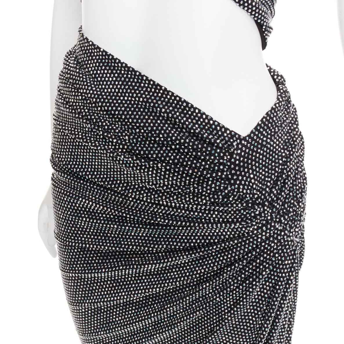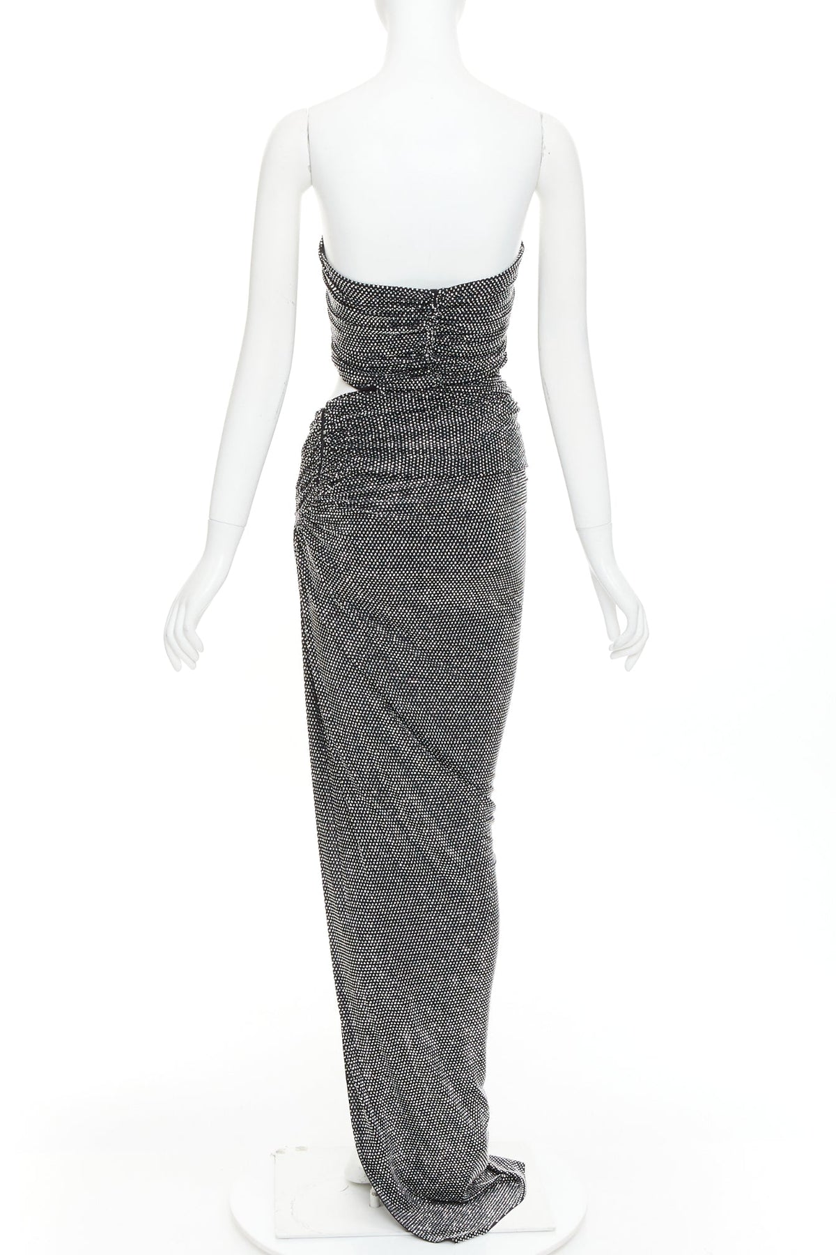 Extra Details: Twisted bandeau bodice. Cut out at waist. Side draped slit. Zip closure. Fully enbellished in silver strass crystals.
