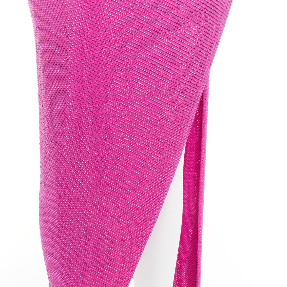 Extra Details: The gown features a classic Vauthier "glam-rock" aesthetic with a strapless sweetheart neckline and a form-fitting, ruched bodice. It is characterized by a daring high side slit and a dramatic, matching draped neck cape (or scarf) that flows into a long train. The piece is crafted from a fuchsia-toned stretch-jersey fabric that is entirely covered in shimmering micro-crystals, a signature of the designer's high-octane glamour.