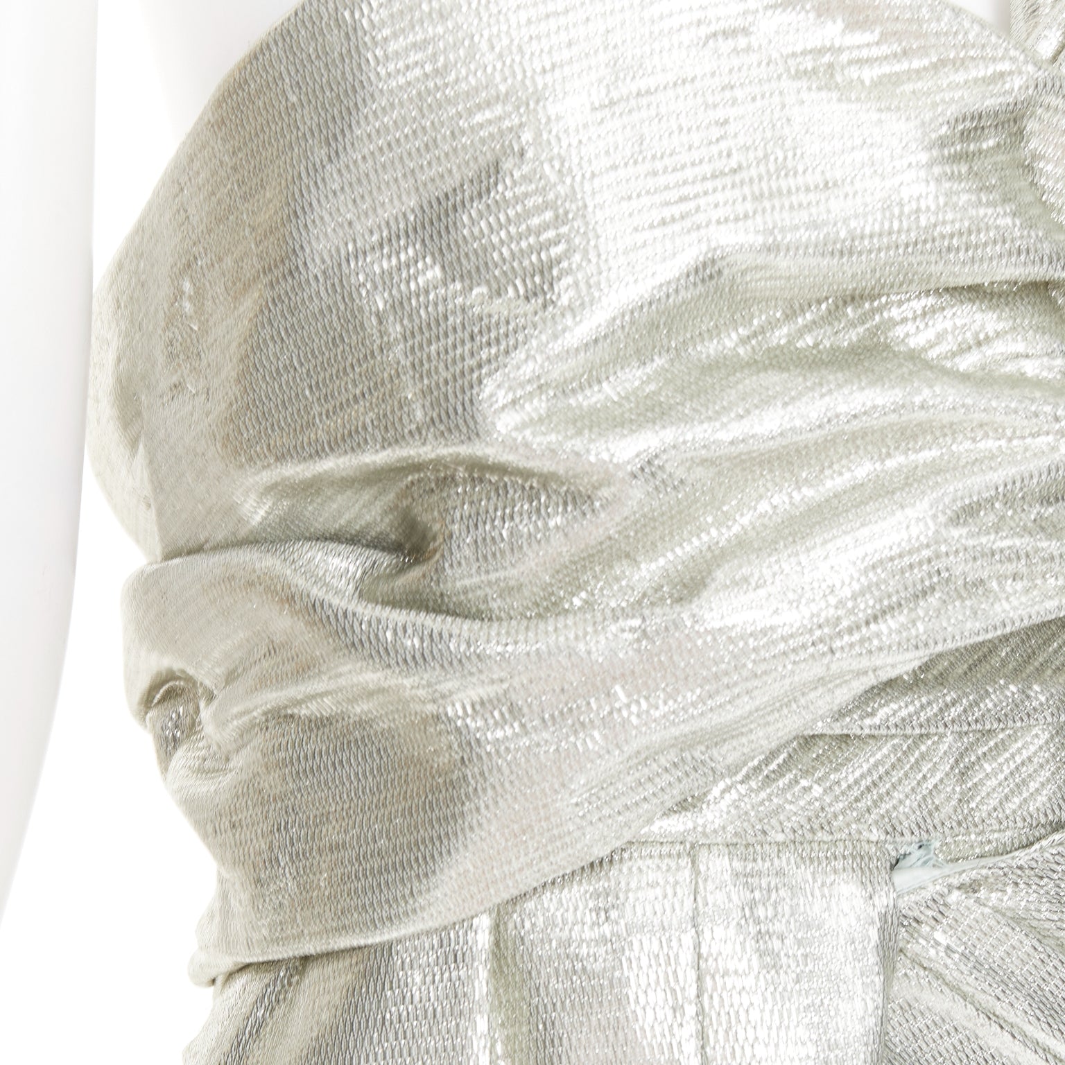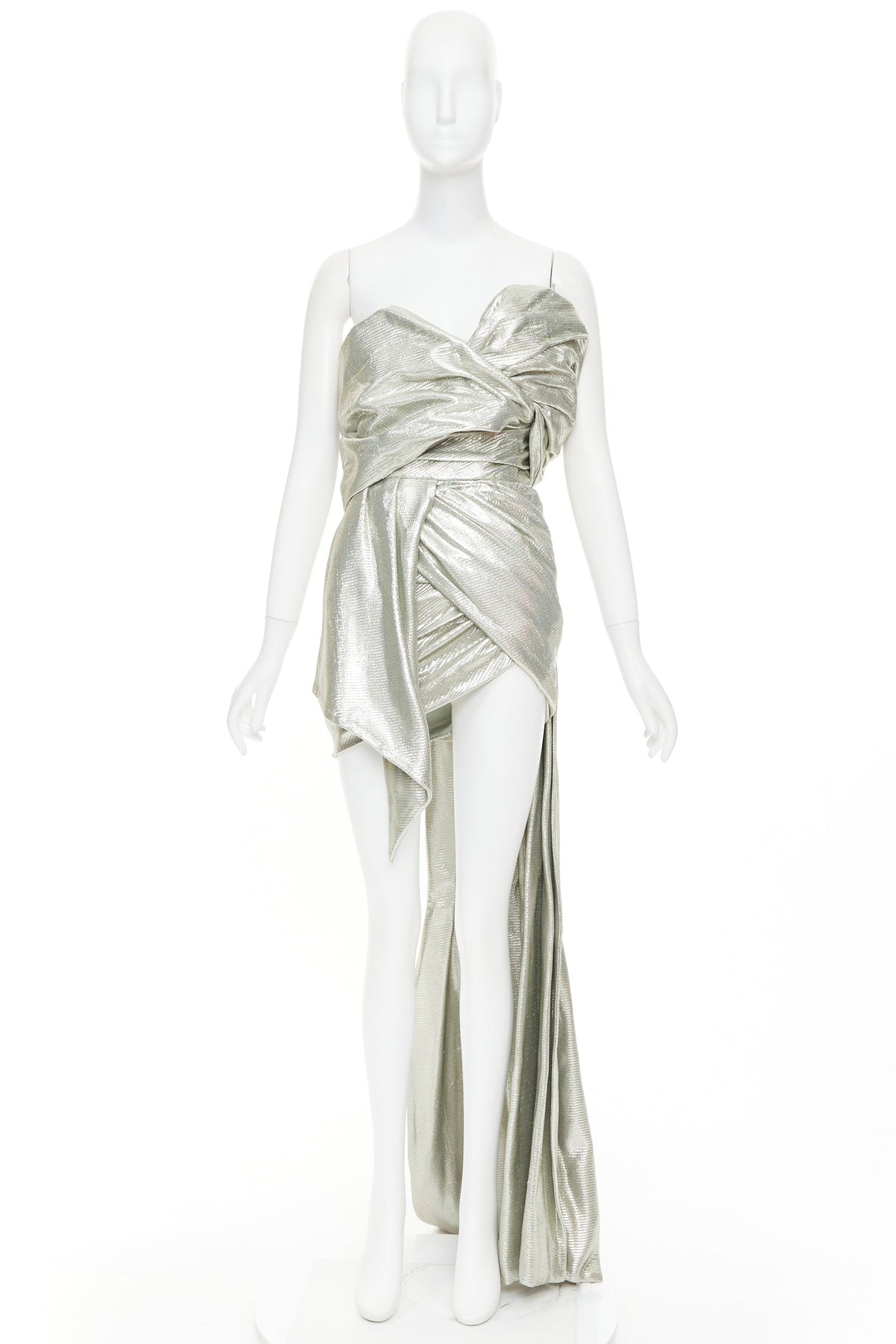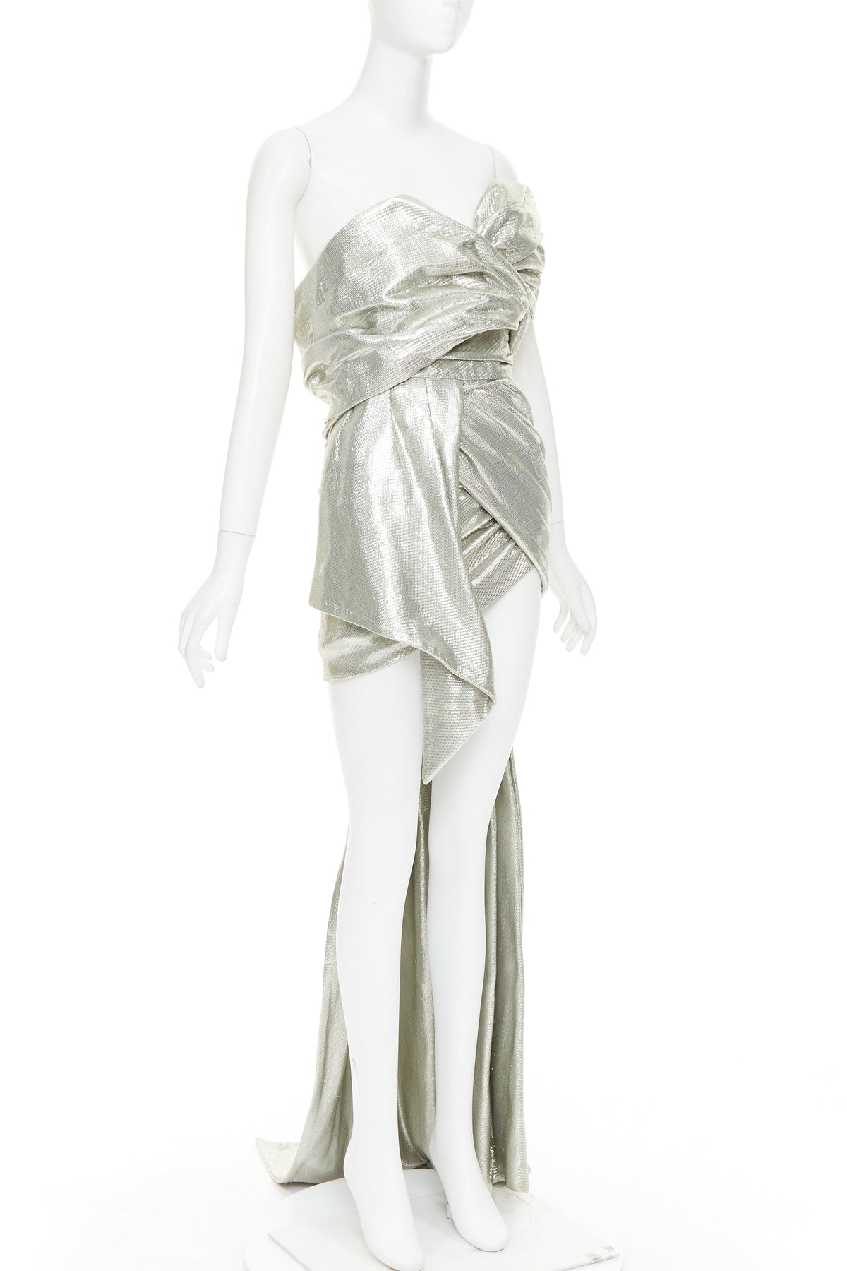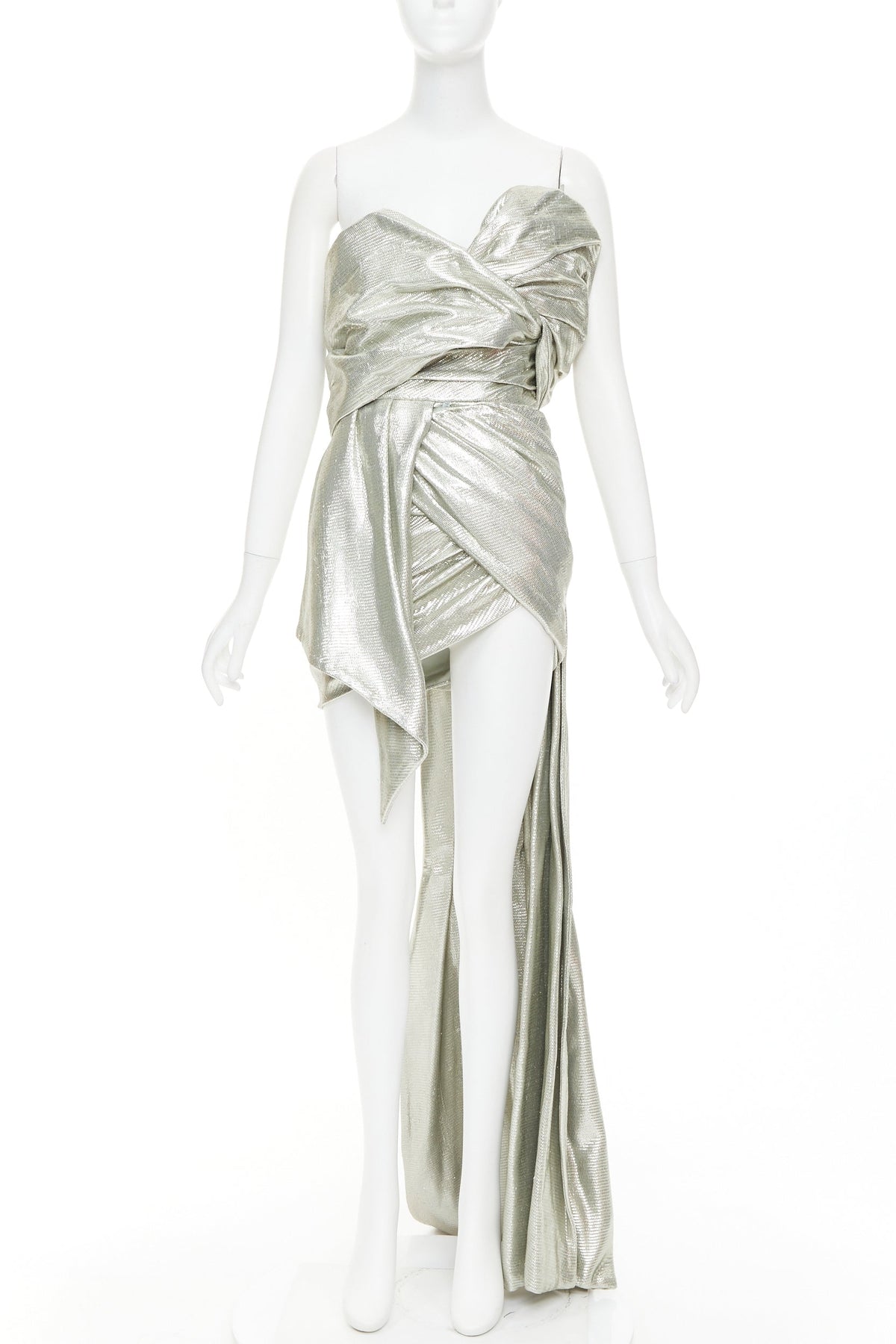 Extra Details: Boned corset construction in satin. Metallic lame ruched draped fabric. Concealed snap button to hold drapery around bodice. Mini dress with train.