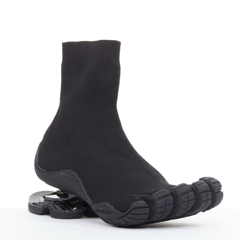 Extra Details: With a flexible Vibram® sole, these black high-top sneakers from Balenciaga are made in a sock-like knit construction, have a raised heel and individual toe inserts.