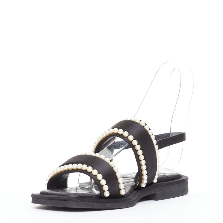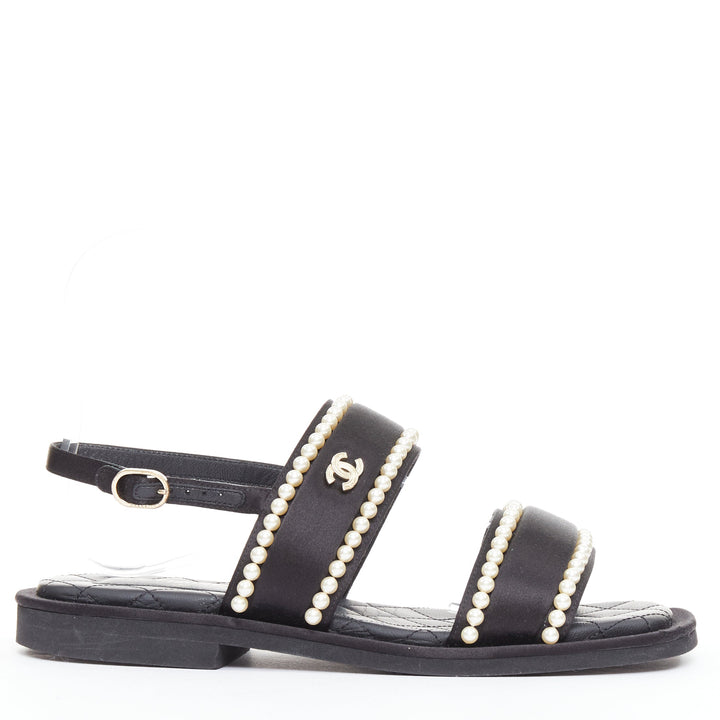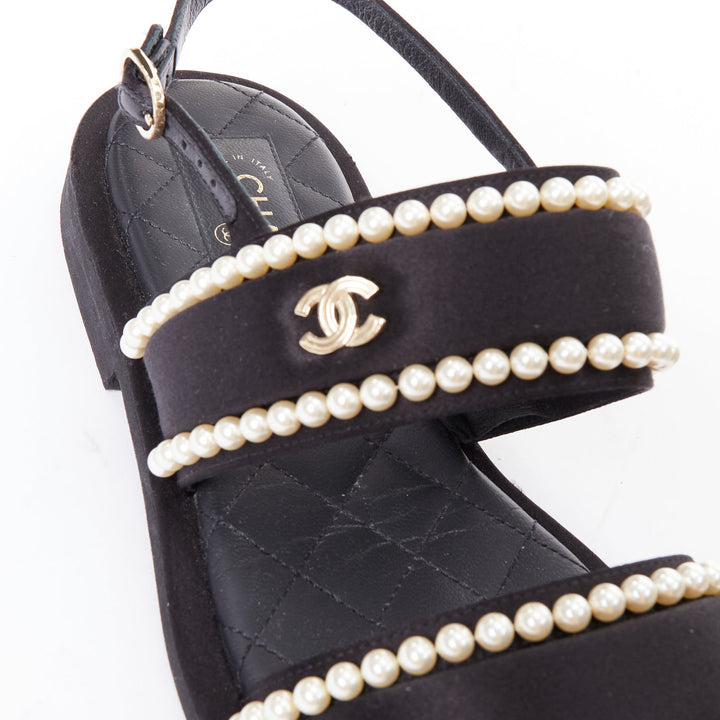 CHANEL 2022 black pearl embellished satin CC flat dad sandals EU36.5