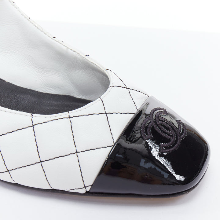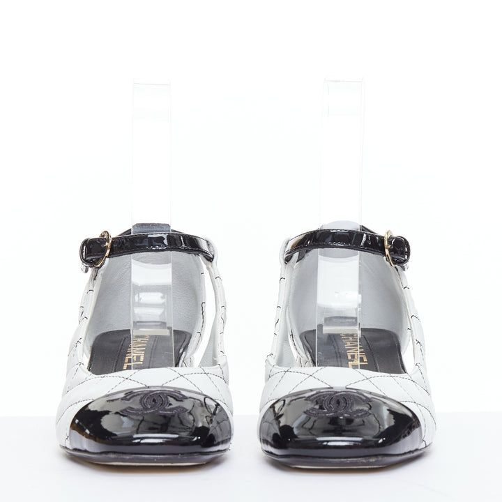 CHANEL 2022 black white quilted topstitch patent cap toe maryjane heels EU36.5