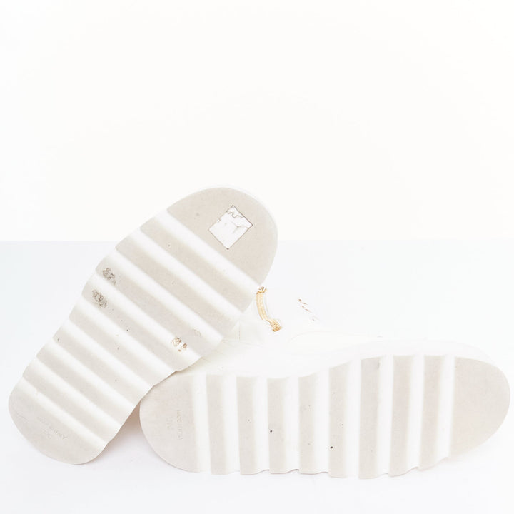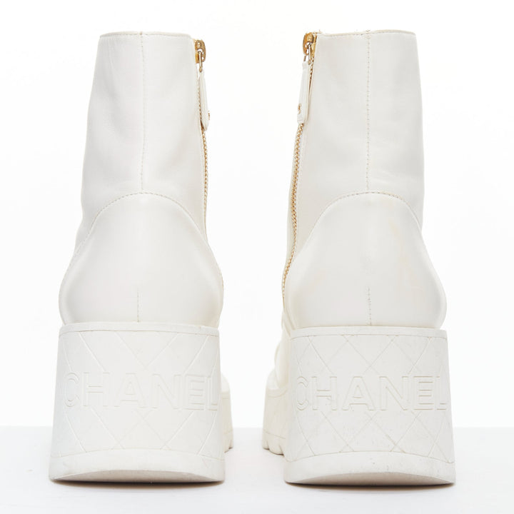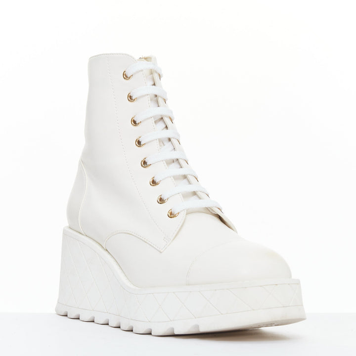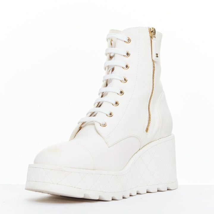 CHANEL 2024 white leather CC logo grid platform lace up wedge boots EU39