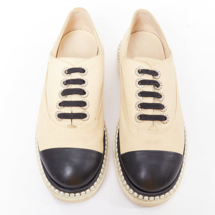CHANEL beige black monochrome leather faux pearl lace up derbies EU35.5