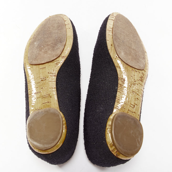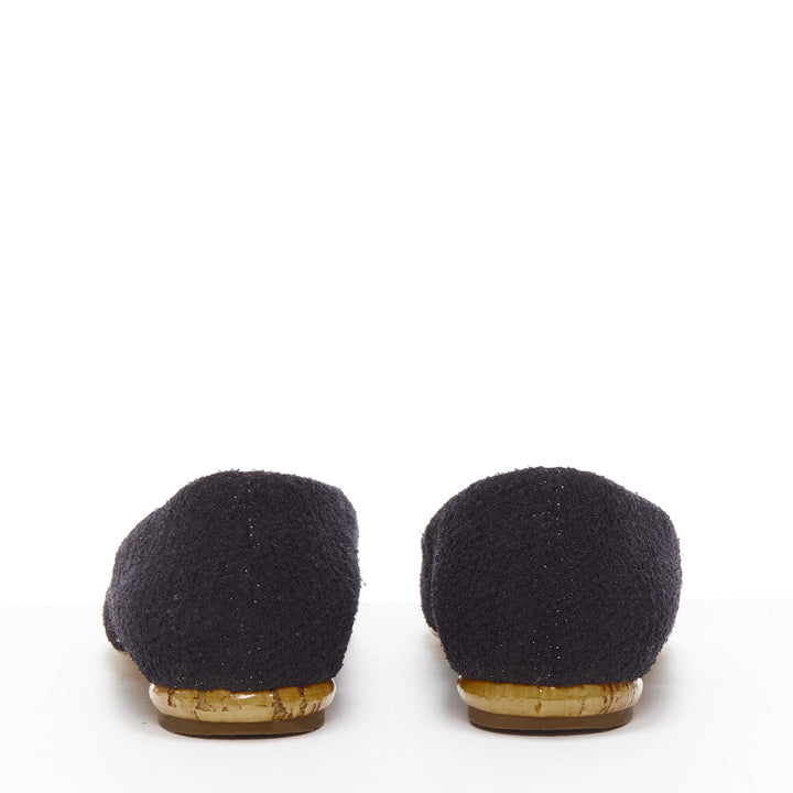 CHANEL black tweed crystal CC embellished logo round toe flat shoes EU35