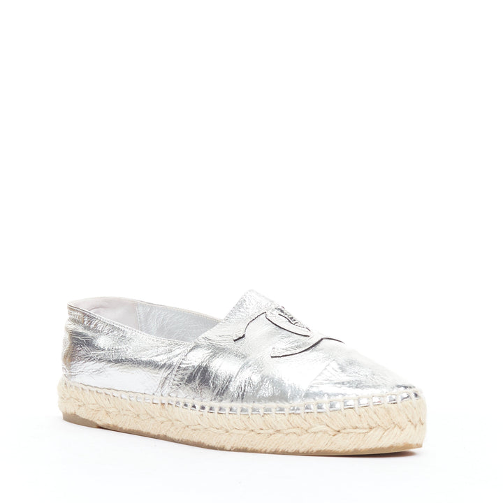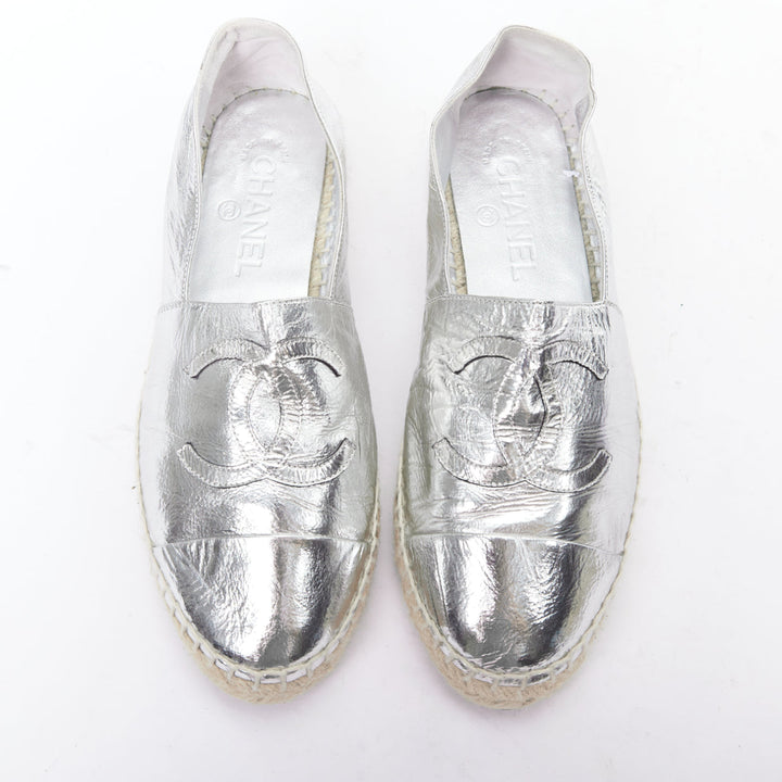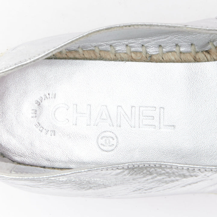 CHANEL metallic silver laminated goatskin CC logo jute espadrilles EU38