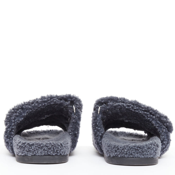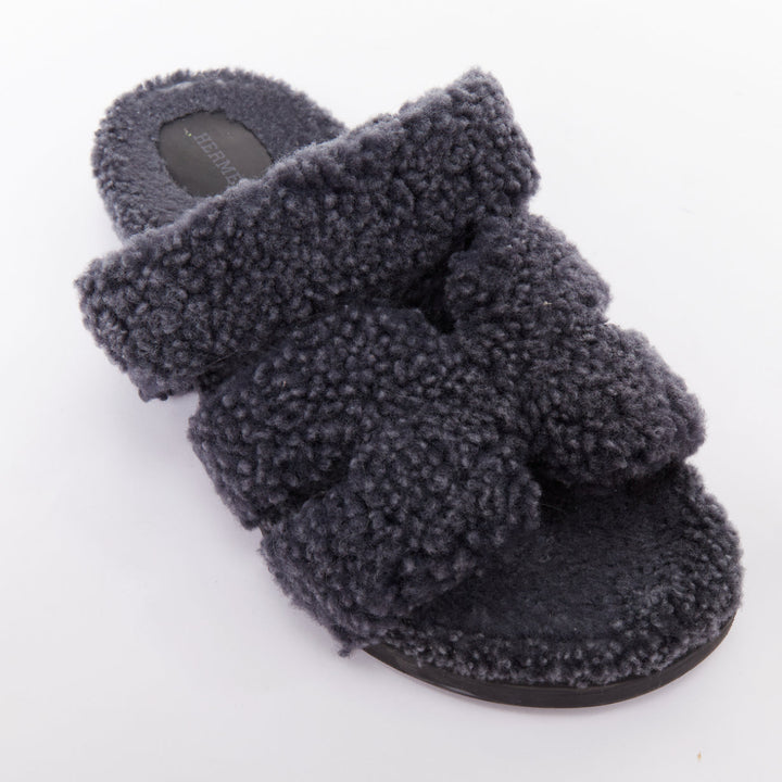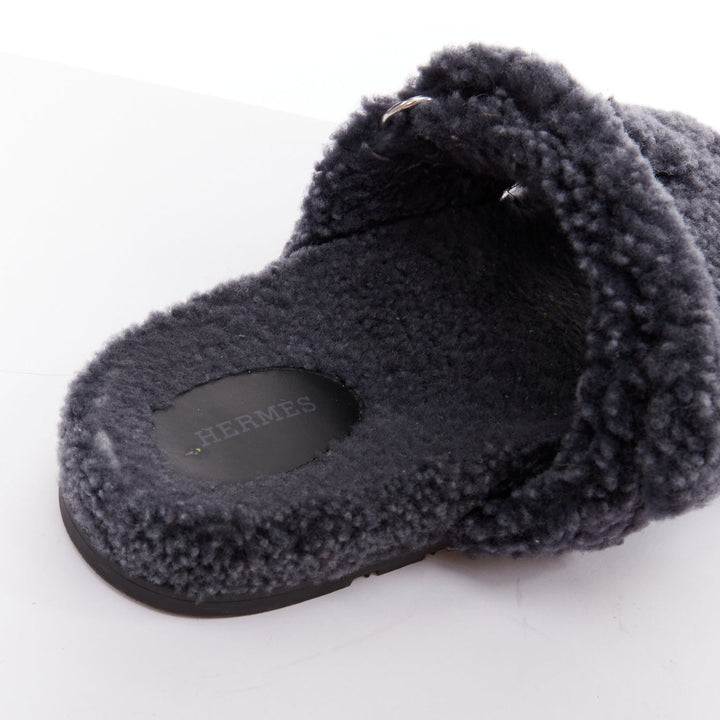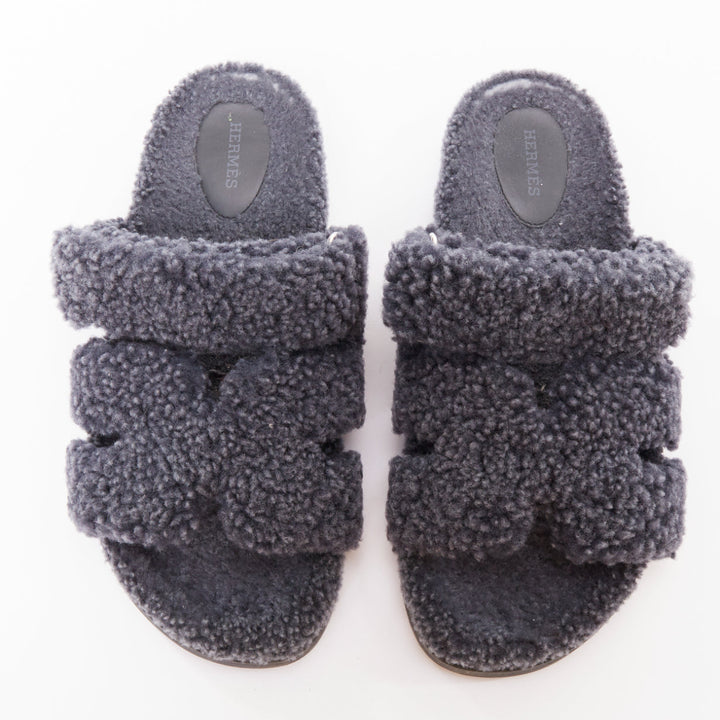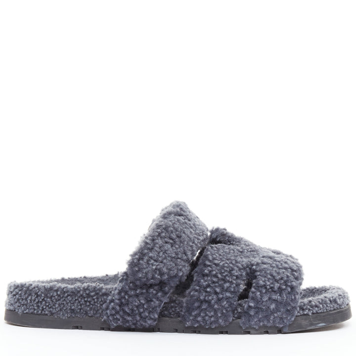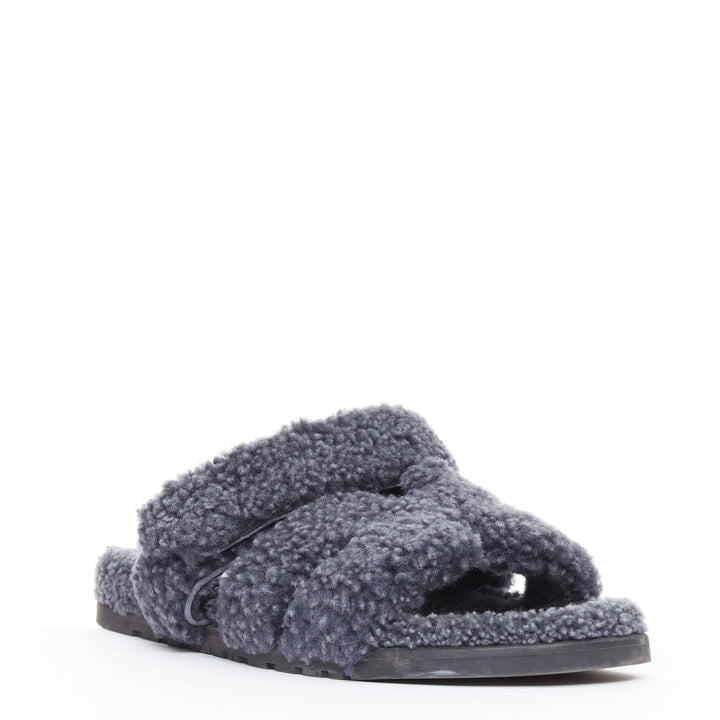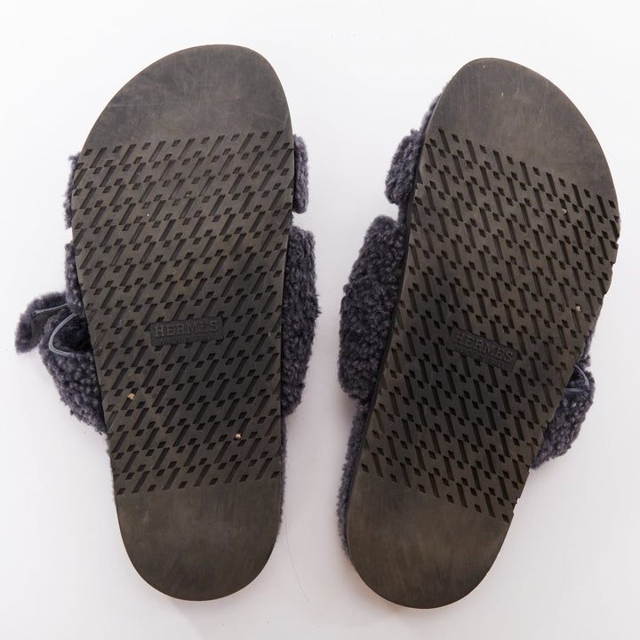 HERMES Chypre grey shearling H adjustable strap techno sandal EU41