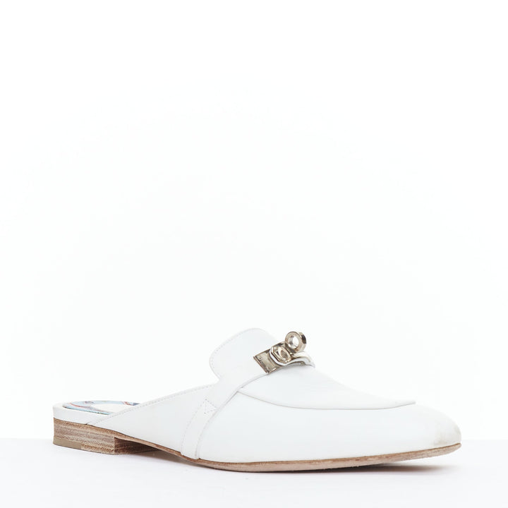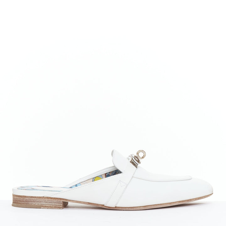 HERMES Oz white calfskin leather silver Kelly turnlock mules EU37