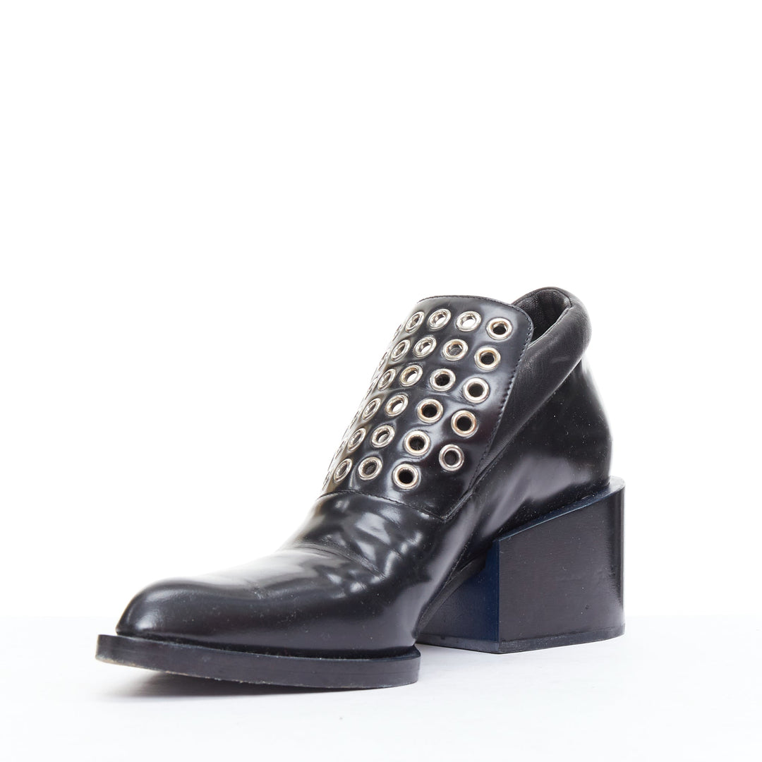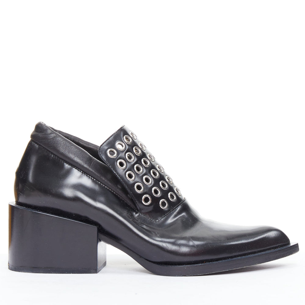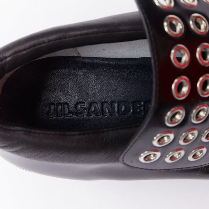 JIL SANDER silver grommet black leather block heel loafer EU38