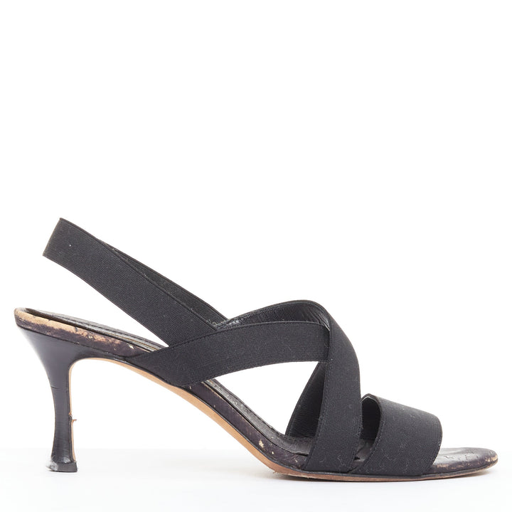 MANOLO BLAHNIK black elastic strap cork sole spool mid sandals EU37