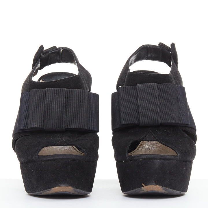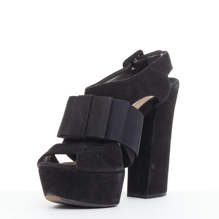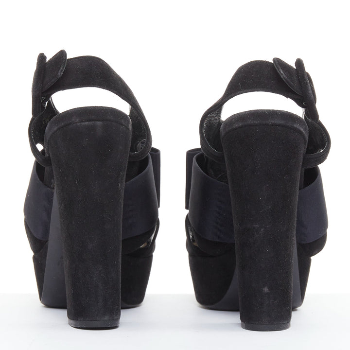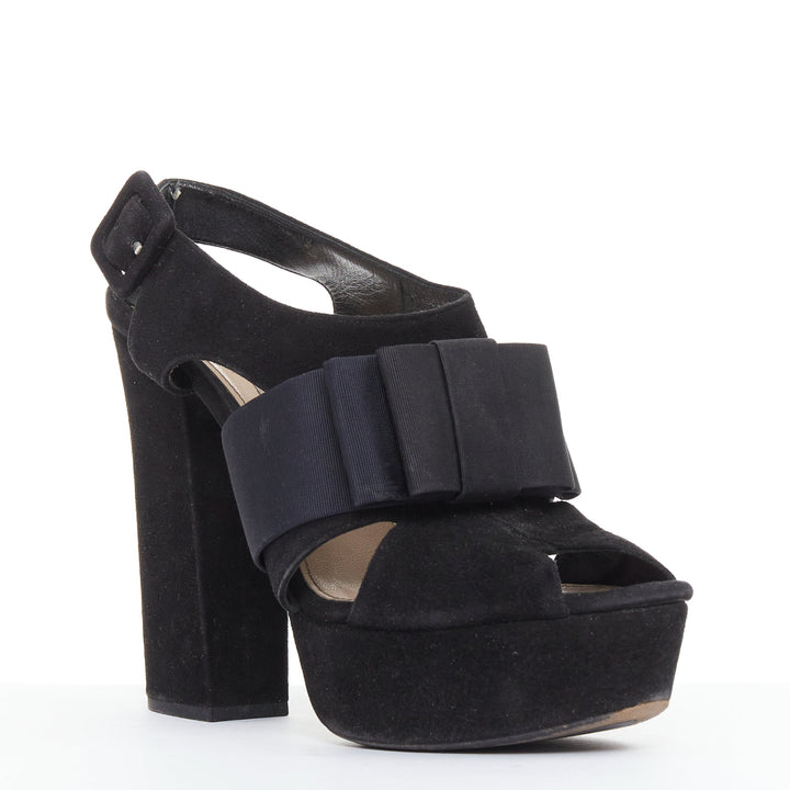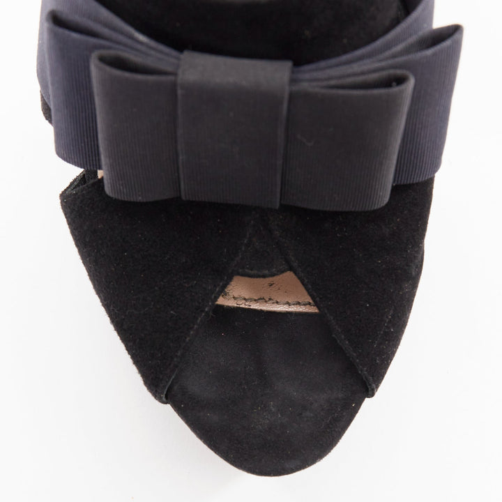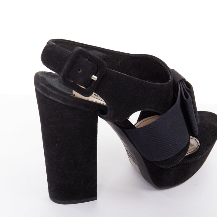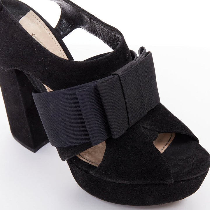 MIU MIU black suede grosgrain origami bow chunky platform heels EU35