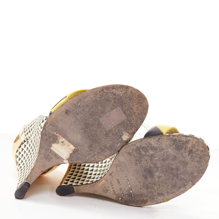 SERGIO ROSSI gold cap heel geometric yellow black wedge sandals EU36