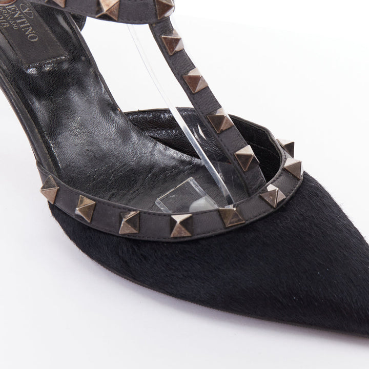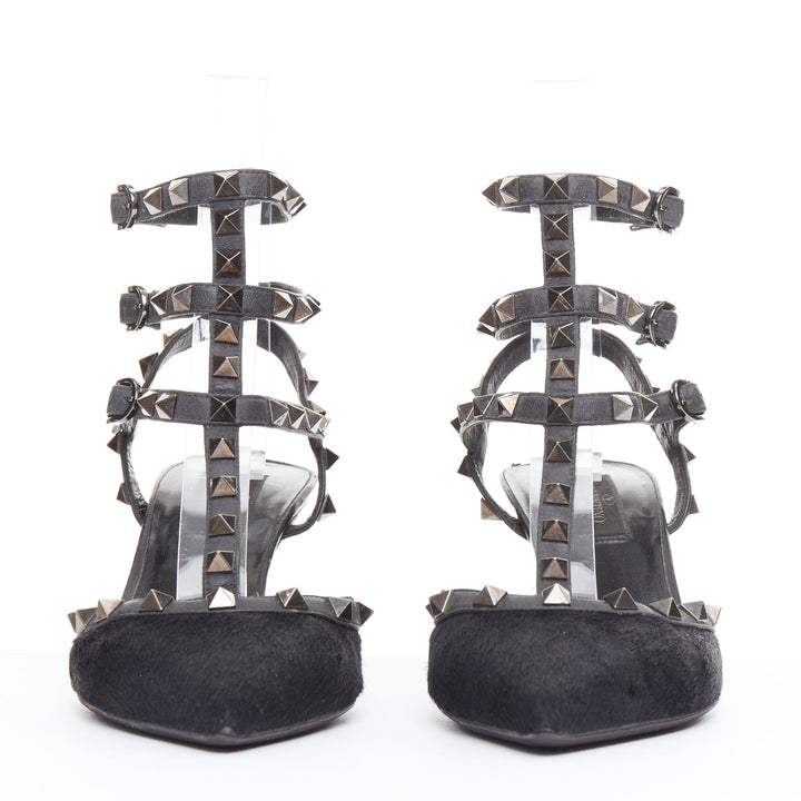 VALENTINO Rockstud Noir black horsehair silver studs pointy cage sandals EU37.5