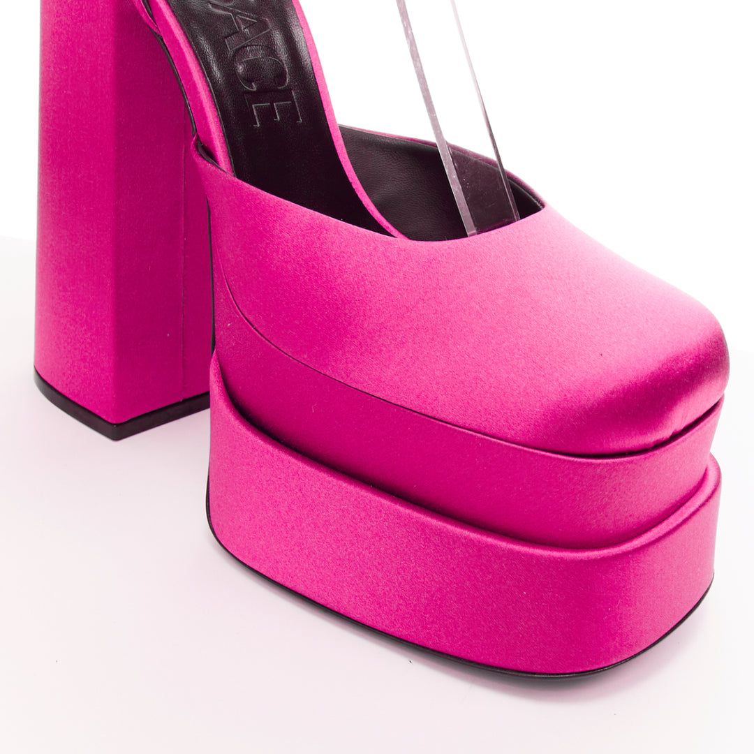 Extra Details: The extremely iconic Versace Aevitas pump in 'Deep Fuxia' fuschia pink satin. Celebrity favorite straight from the runway- wear these classics forever. These silk-satin pumps from the Aevitas line feature a high-block heel and double platform. The ankle strap is adorned with gold-tone hardware and tonal pink strass crystals in gradient sizes with a single gold-tone signature Medusa charm. Rounded square toe dorsay silhouette.