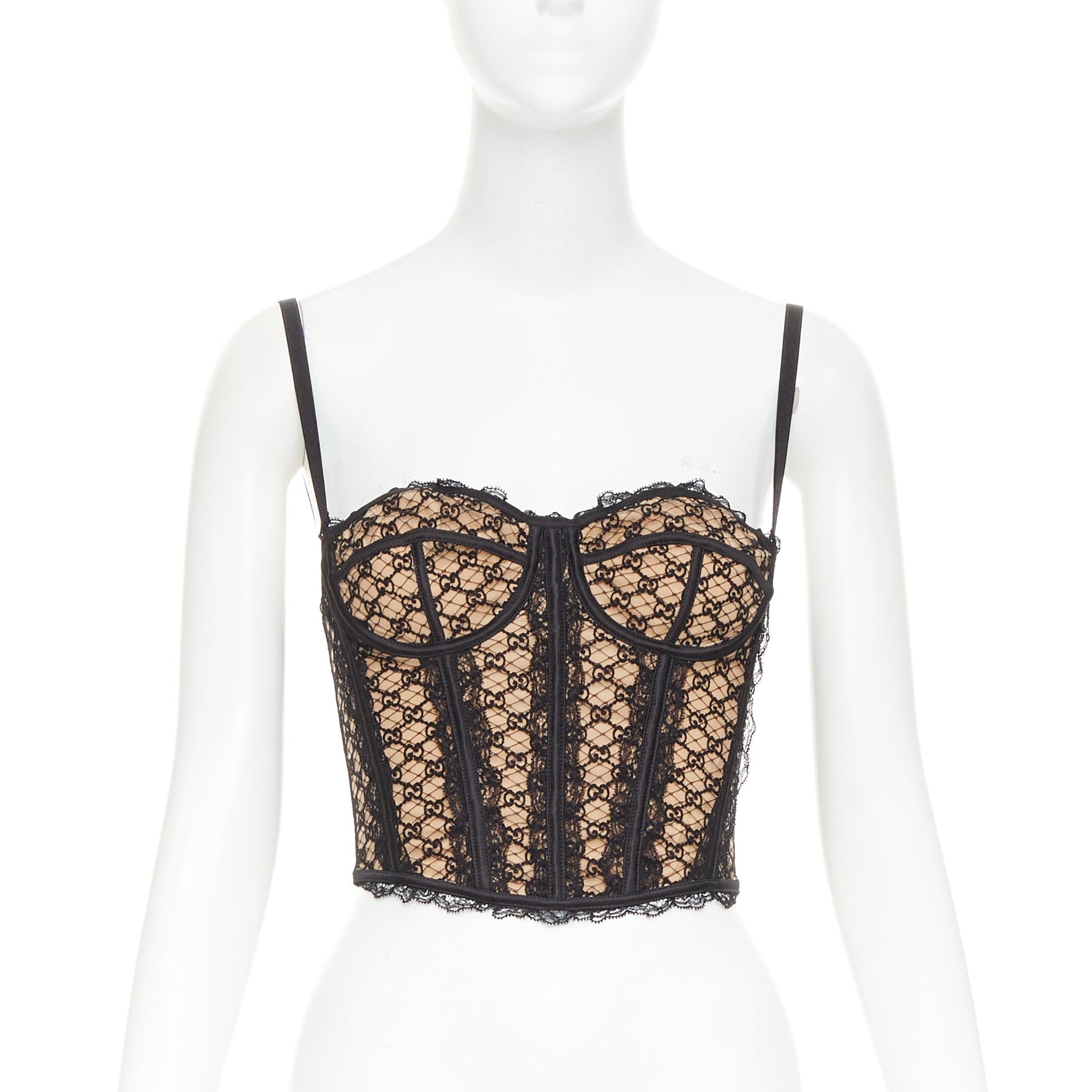 GUCCI 2022 Runway Aria black beige GG monogram net lace corset bustier top S