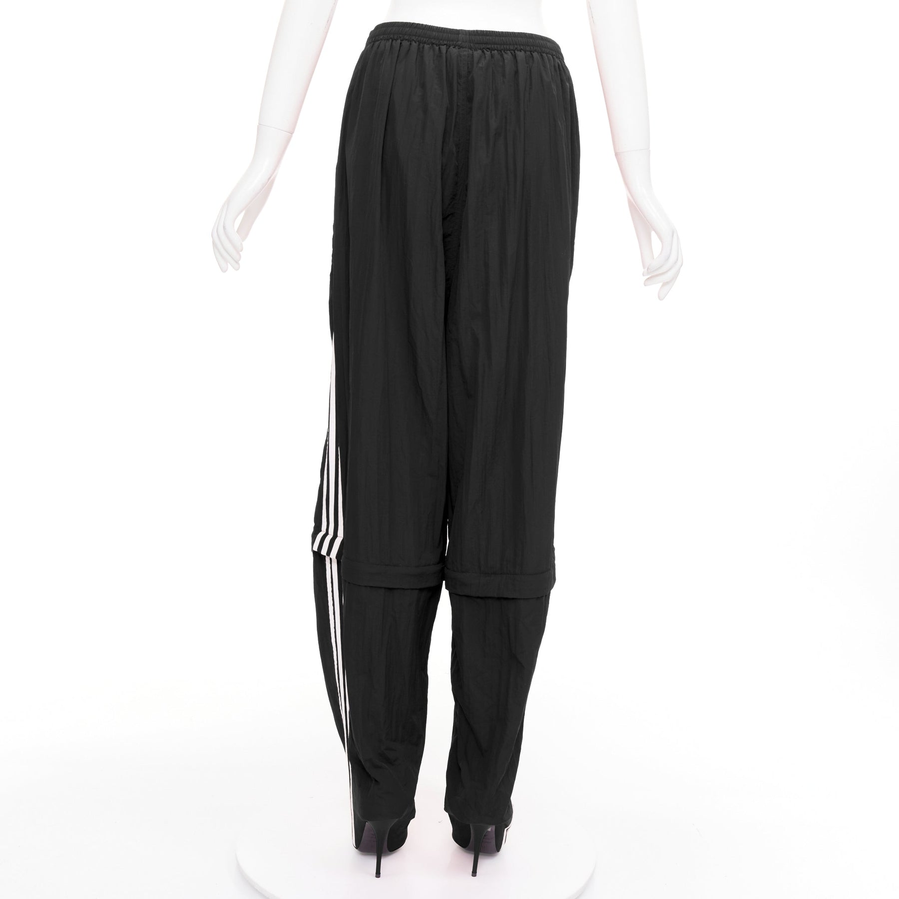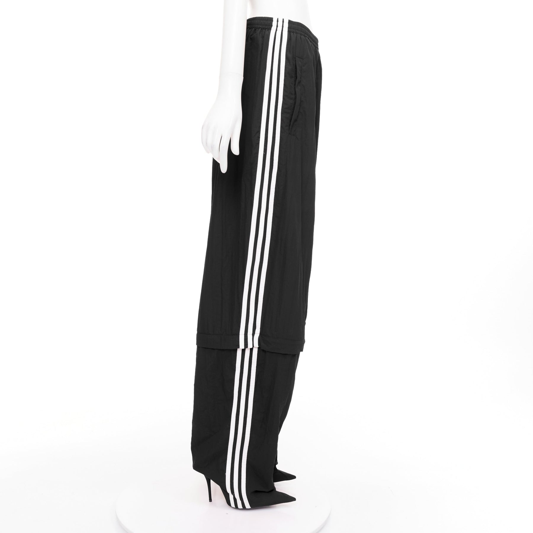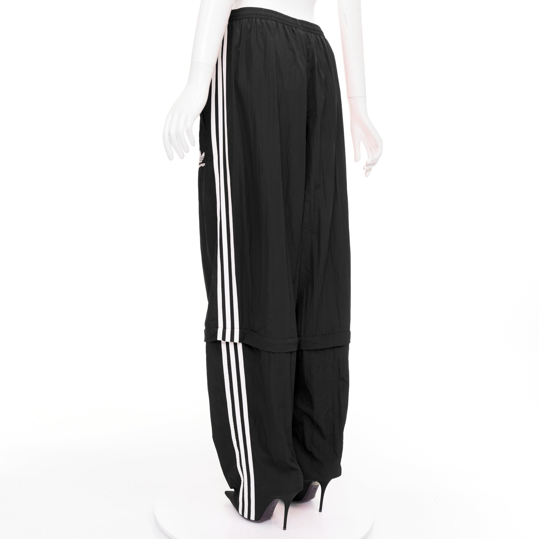 Extra Details: These are track pants that seamlessly integrate into a pair of high-heeled boots, creating a single, continuous silhouette. The pant portion is made from a technical fabric while the integrated "New Knife" boots are with a leather insole and sole. Have a zipper at the knee length to detach the boot portion, allowing the pants to be worn separately or converted into shorts. The pants feature an extra-long, relaxed fit, an elasticated waistband, and are adorned with the iconic white Adidas 3-Stripes down the side seams and the Adidas Trefoil logo paired with the Balenciaga name on the front.