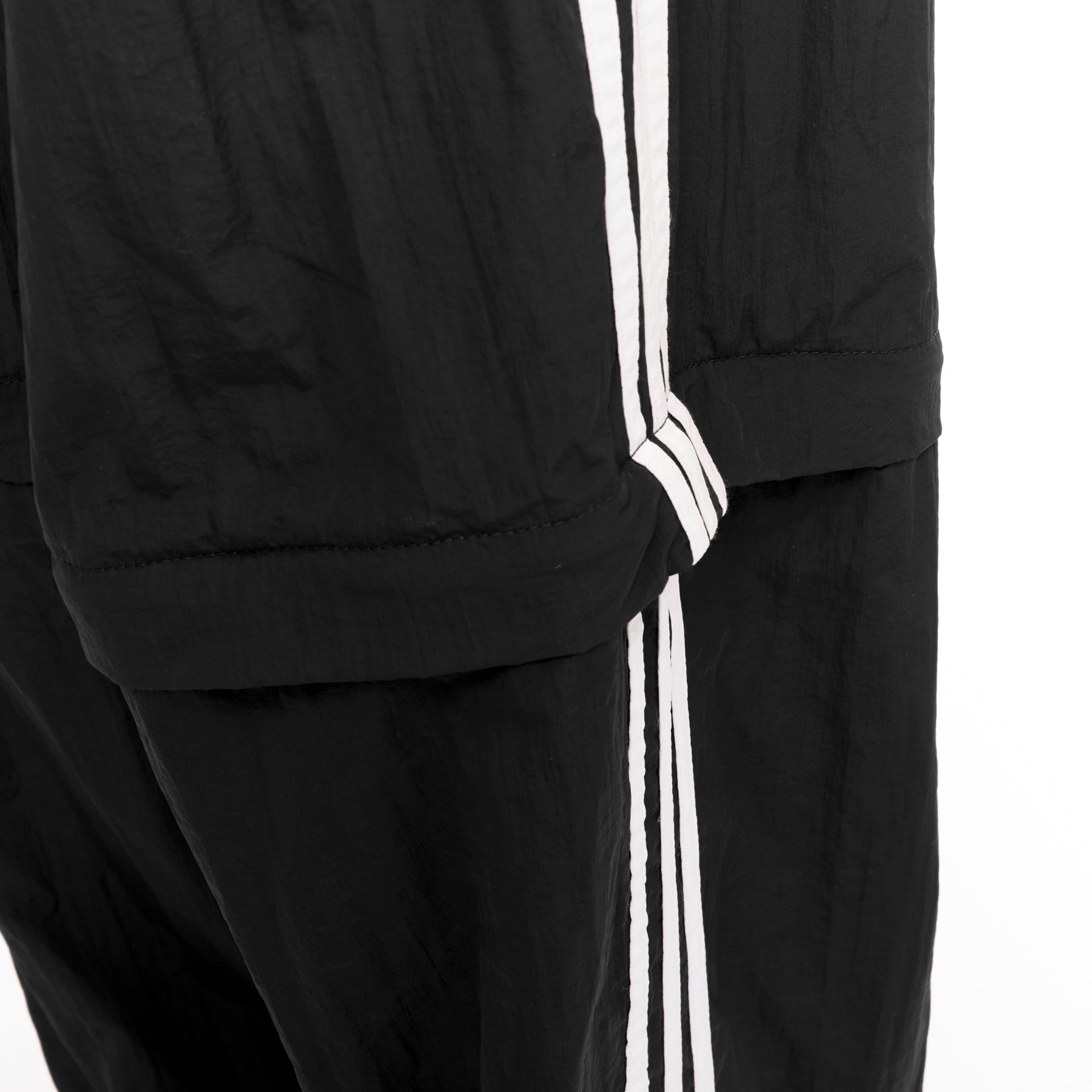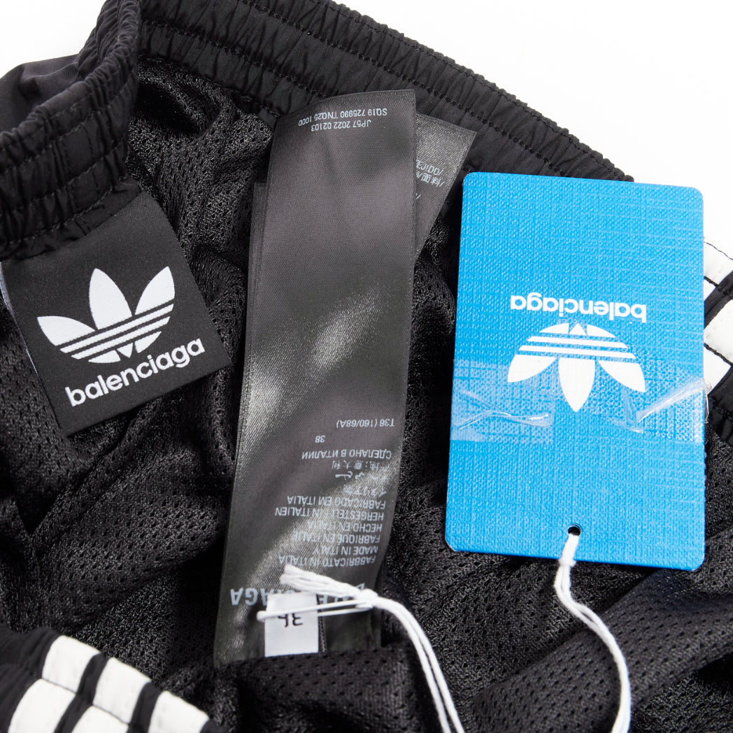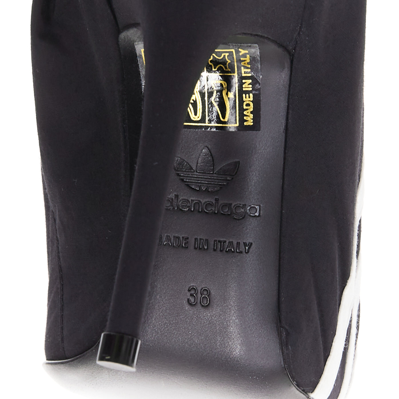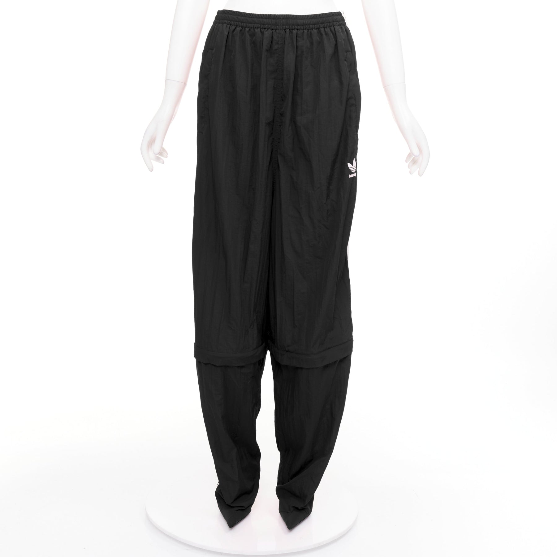 Extra Details: These are track pants that seamlessly integrate into a pair of high-heeled boots, creating a single, continuous silhouette. The pant portion is made from a technical fabric while the integrated "New Knife" boots are with a leather insole and sole. Have a zipper at the knee length to detach the boot portion, allowing the pants to be worn separately or converted into shorts. The pants feature an extra-long, relaxed fit, an elasticated waistband, and are adorned with the iconic white Adidas 3-Stripes down the side seams and the Adidas Trefoil logo paired with the Balenciaga name on the front.