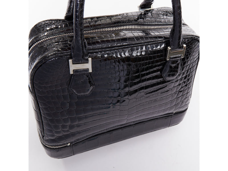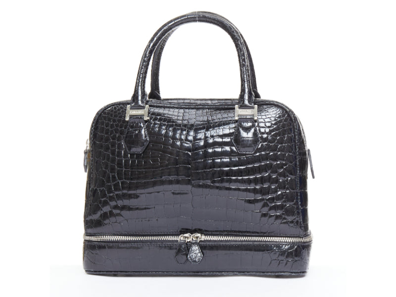 KWANPEN black high shine glossy scaled leather silver hardware zipper top handbag