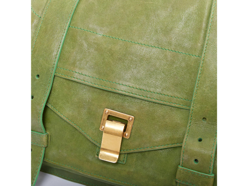 Extra Details: Proenza Schouler PS1 Medium Satchel in the green leather with gold-tone hardware. This bag features a top handle, a detachable shoulder strap, and signature details like a flap front with a metal clasp closure and belted straps.