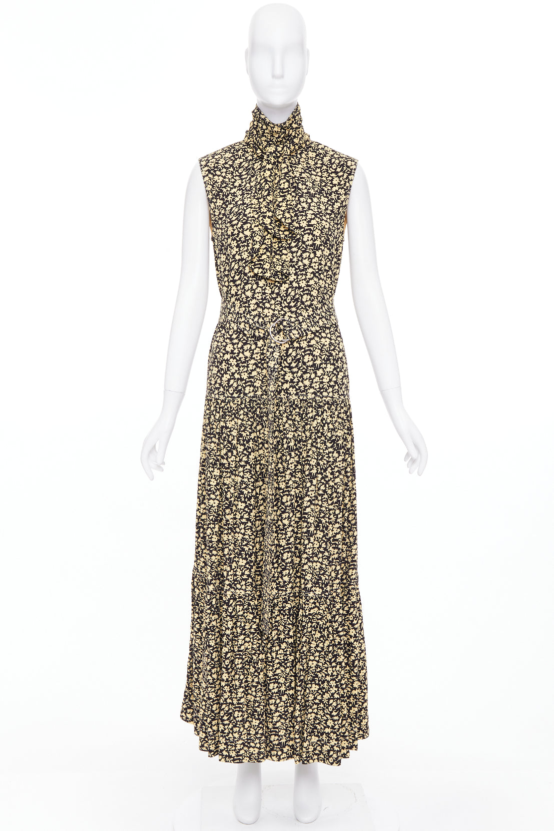 Extra Details: Céline 2016 Floral Crepe Scarf Maxi Dress features a striking black background adorned with yellow jacquard floral motifs. It has a mock neck with a detachable self-scarf, sleeveless design, and pleated details at the chest. The dress includes a self waist belt with a D-ring fastening, a pleated skirt, and a peplum hem. A cutout detail at the center back adds a unique touch, while the concealed zipper with hook and eye fastening ensures a seamless fit. Lined and ankle-length, this dress is made in France for a luxurious finish.