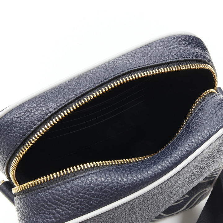 Extra Details: Pop Medusa collection. Genuine grained calf leather. Navy blue with grey Medusa print. Grey leather piping. Gold-tone hardware. Black Greca nylon shoulder strap
