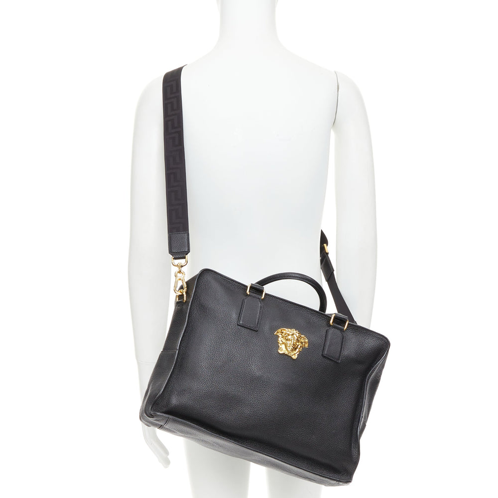 Extra Details: Versace introduces their classic Greek-inspired iconography to a practical travel silhouette with this Medusa Palazzo laptop bag from their SS18 collection. Practical and stylish, the accessory has been crafted in Italy from lightweight black leather with sleek gold-tone accents. It features round top handles, gold-tone hardware, an adjustable shoulder strap, a top zip fastening, an internal zipped pocket, internal patch pockets and an internal logo patch. Material:Calf Leather. Colour: black