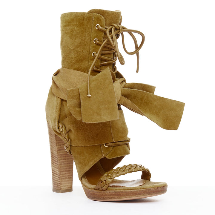 GIANVITO ROSSI tan suede leather braid strap ribbon tie block heels EU37