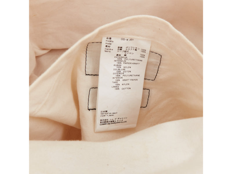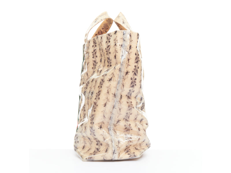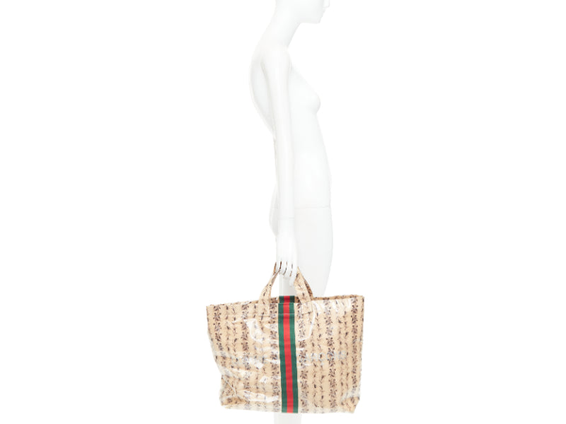 Extra Details: 2021 release. Made of brown paper with black floral print. Covered in durable clear plastic vinyl . Silver Comme des Garcons logo print detail. Signature Gucci red and green stripe down center of bag. Natural cotton canvas lining, 1 interior pocket.