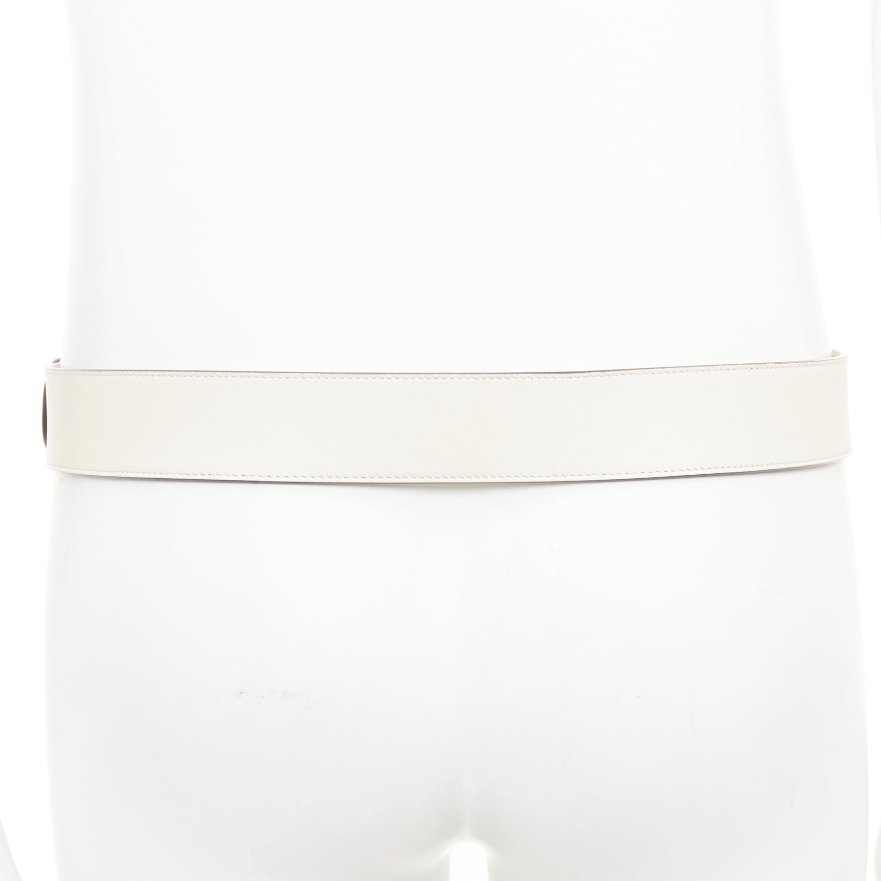 Extra Details: White leather belt featuring antiqued brass hardware with a shiny finish and a double G buckle. Buckle dimensions: W 7.7 cm x H 6 cm. The belt width is 4 cm. Made in Italy. Can be worn as a hip or waist belt; sizing will differ based on where the belt is worn.