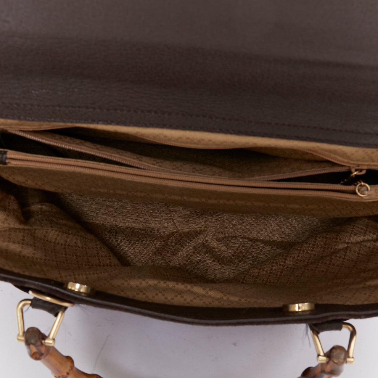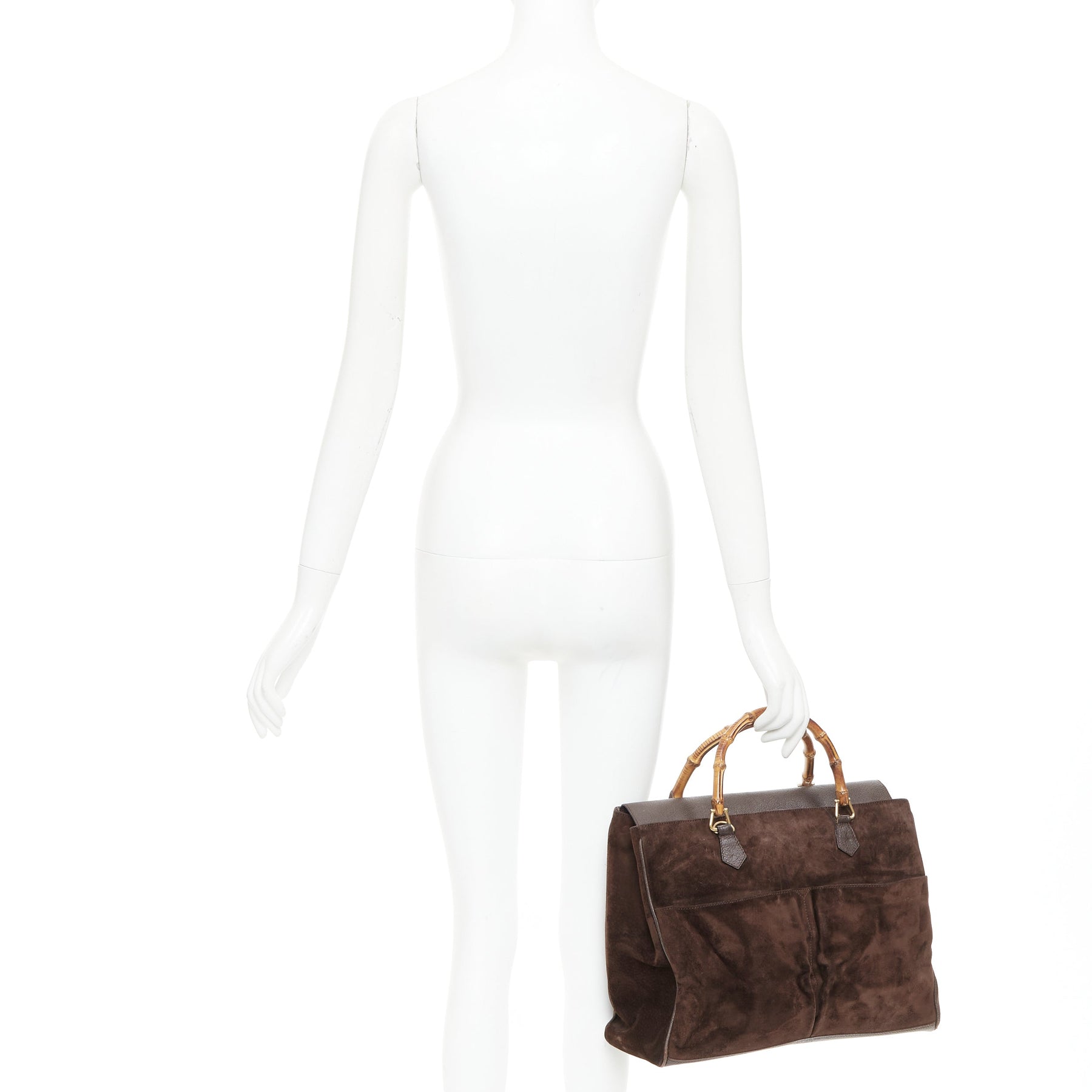 Extra Details: Gucci top handle bag in brown suede featuring a bamboo accent and gold-tone hardware. It has leather trim and bamboo handles, along with dual exterior pockets. The interior is lined with nylon and includes dual interior pockets. The bag features a snap closure at the top and protective feet at the base.